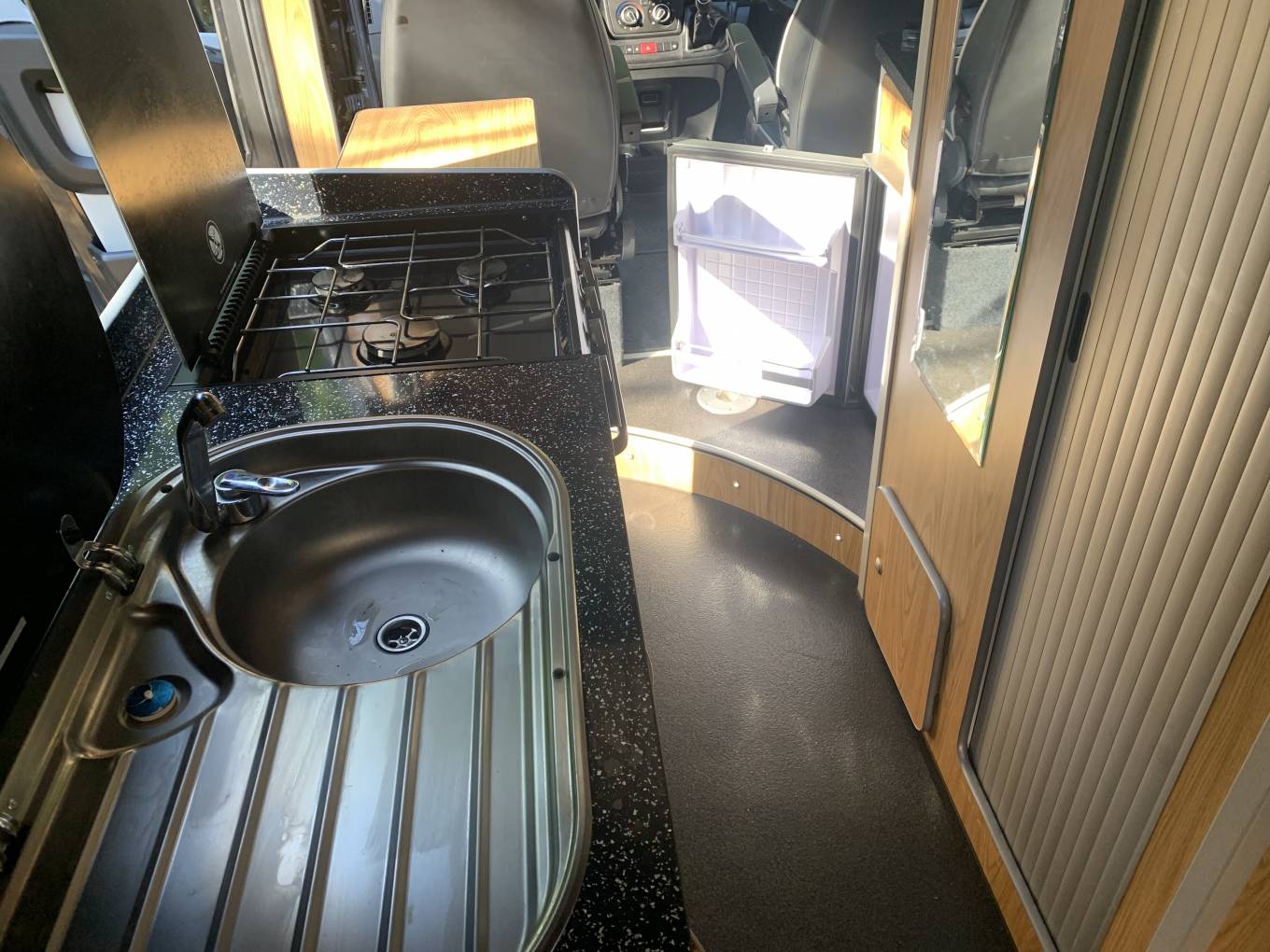 burners, microwave, sink, pop up worktop by the sliding door and fixed worktop