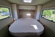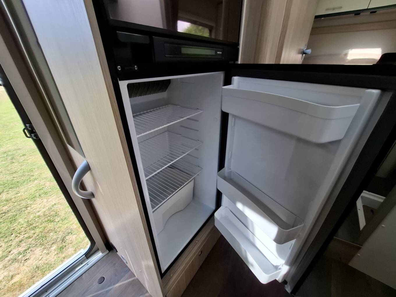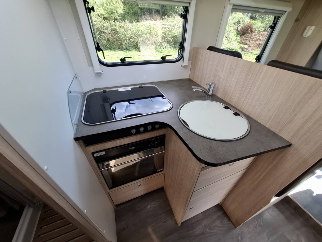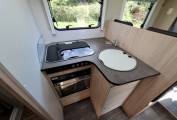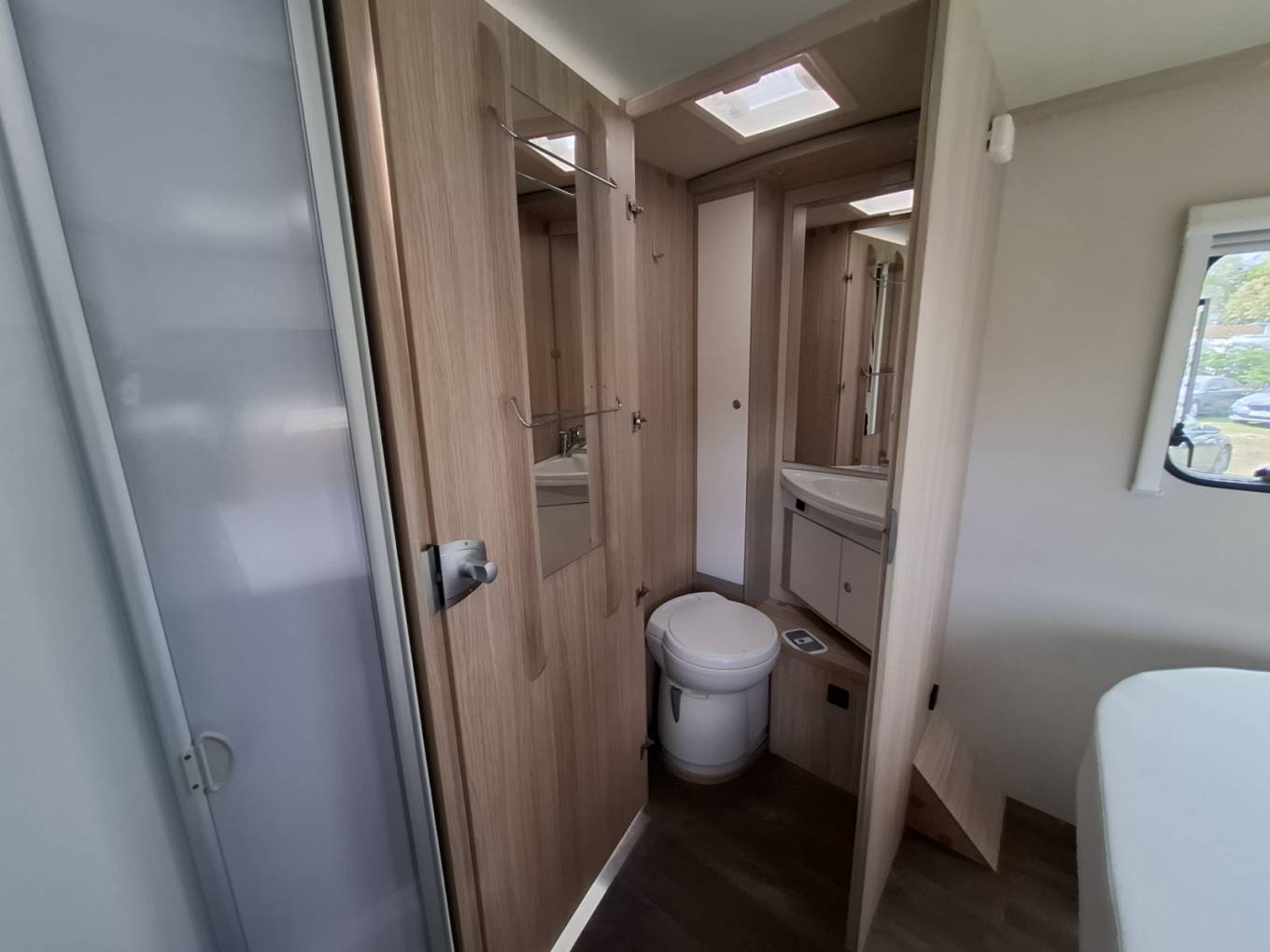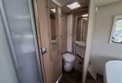 Adjacent to the kitchen is the bathroom area, with an offside toilet and hand basin compartment and a nearside screened shower cubicle. The toilet door can be used to separate the bathroom and rear bedroom from the forward habitation, and there is an additional curtain to screen the bathroom from the bedroom when additional guests are using the forward berth.