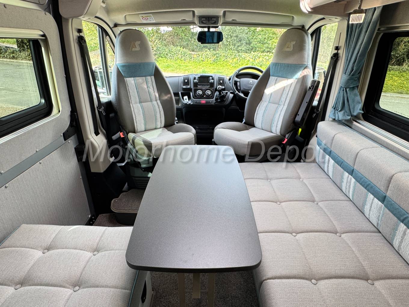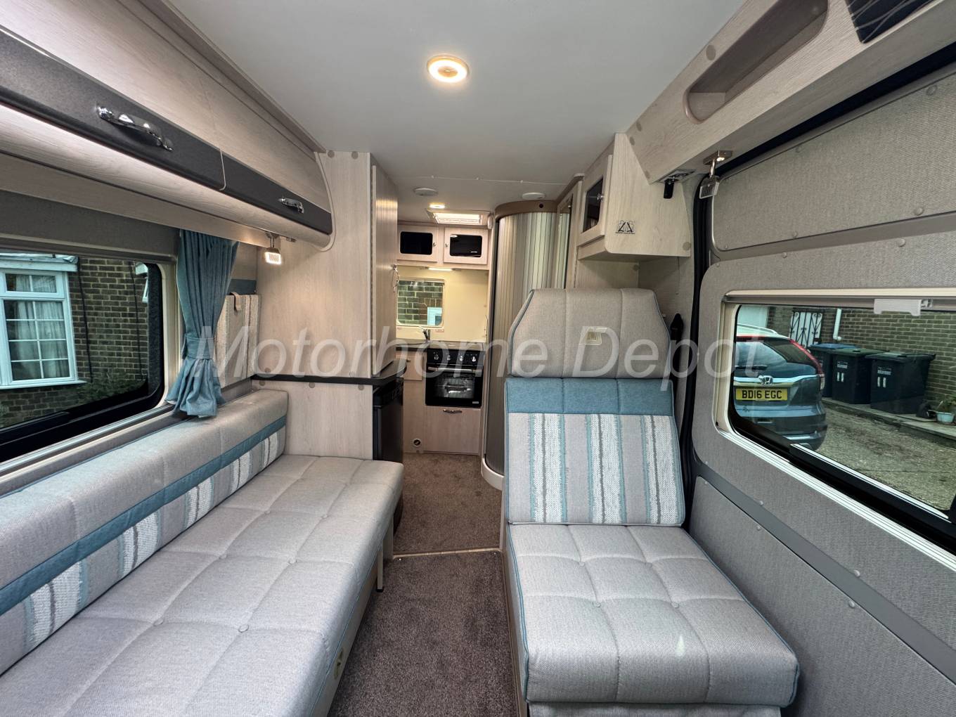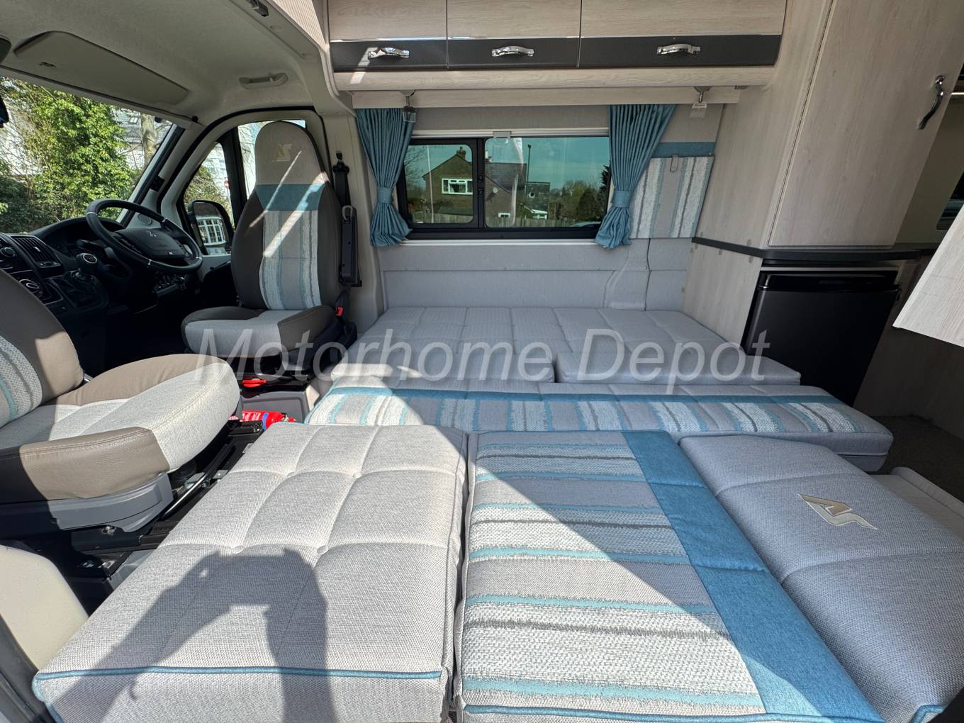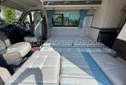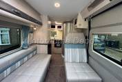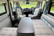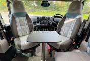 Stepping inside via the electric entry step, you’re greeted by a bright, modern interior finished in neutral tones and premium soft furnishings. Both the front captain’s seats swivel to join the lounge area, creating a sociable space for relaxing or dining. There is a small occasional table that can be situated between the seats for coffee time.