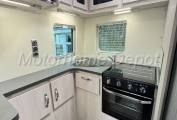 The front lounge features a long sofa on the driver’s side and a single seat with 3 point seat belt by the sliding door there is a larger dining table that stows in the overcab locker. At night the area can be quickly made into a generous double bed. Large windows and a rooflight flood the space with natural light, while LED lighting ensures a warm, inviting feel in the evenings.