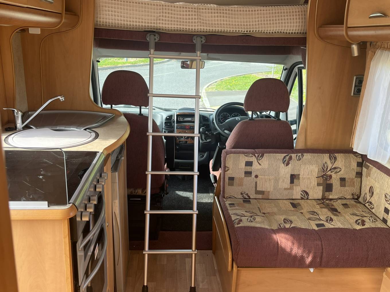 The over-cab double bed is huge and has a proper thick domestic mattress, ladder and restraining net if needed.