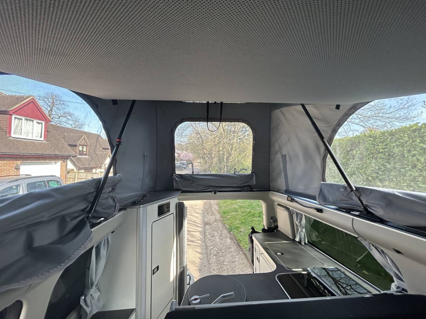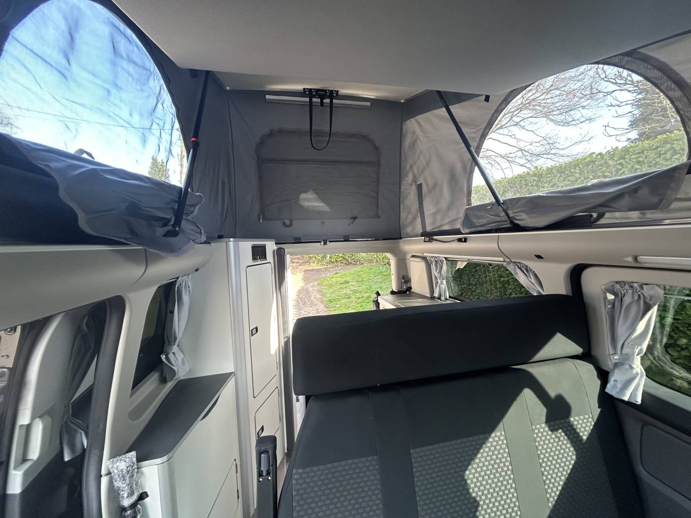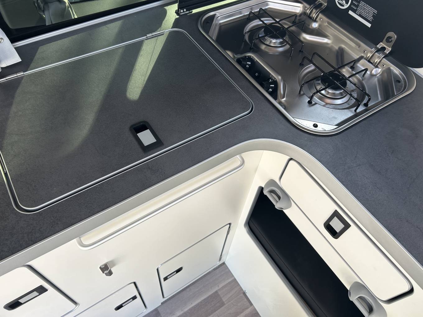 The Nugget Plus has a very clever layout and makes the most of the size available. At the front you have a perfect seating area making use of the two front seats and a double rear seat. There is also a cleverly stored table that can be set up in the middle. Moving back the camper has great kitchen area - with plenty of head room with the Pop-top roof up. It has a large cool box style fridge, hob with 2 burners and sink with hot and cold water. The camper is also ideal to sleep in. There is a good sized double that is made up from the rear sofa and a further double in the Pop-top. This camper also comes with its own Thetford Flush cassette toilet at the rear of the camper which comes with a privacy screen and pull down basin. The camper also comes with heating and hot water - all operated through the simple to use 12 volt control panel.