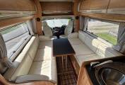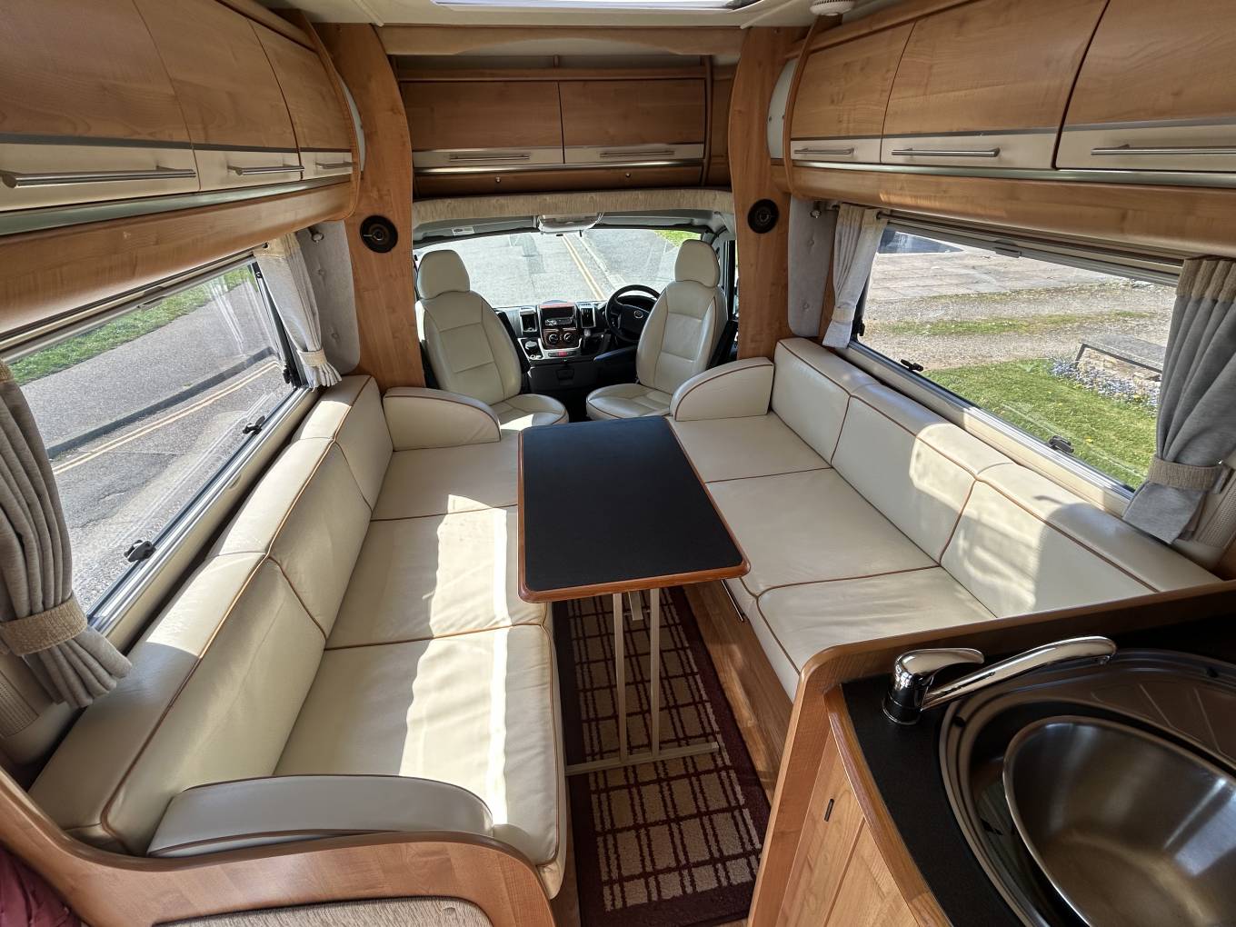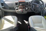 Behind the cab area, you have a beautiful bright centre dinette area that comes with a store away table and the luxury leather upholstery is in very good condition and is easy to maintain, with the side benches and the swivel cab seats you could easily sit up to 6 people in this area. This area also makes a large double bed when required in the time it takes to boil the kettle! The cab area is one that gives you everything you want to be comfy and enjoy the drive when you are travelling to and from your next adventure, you also get plenty of natural light and this is something you notice throughout the motorhome.