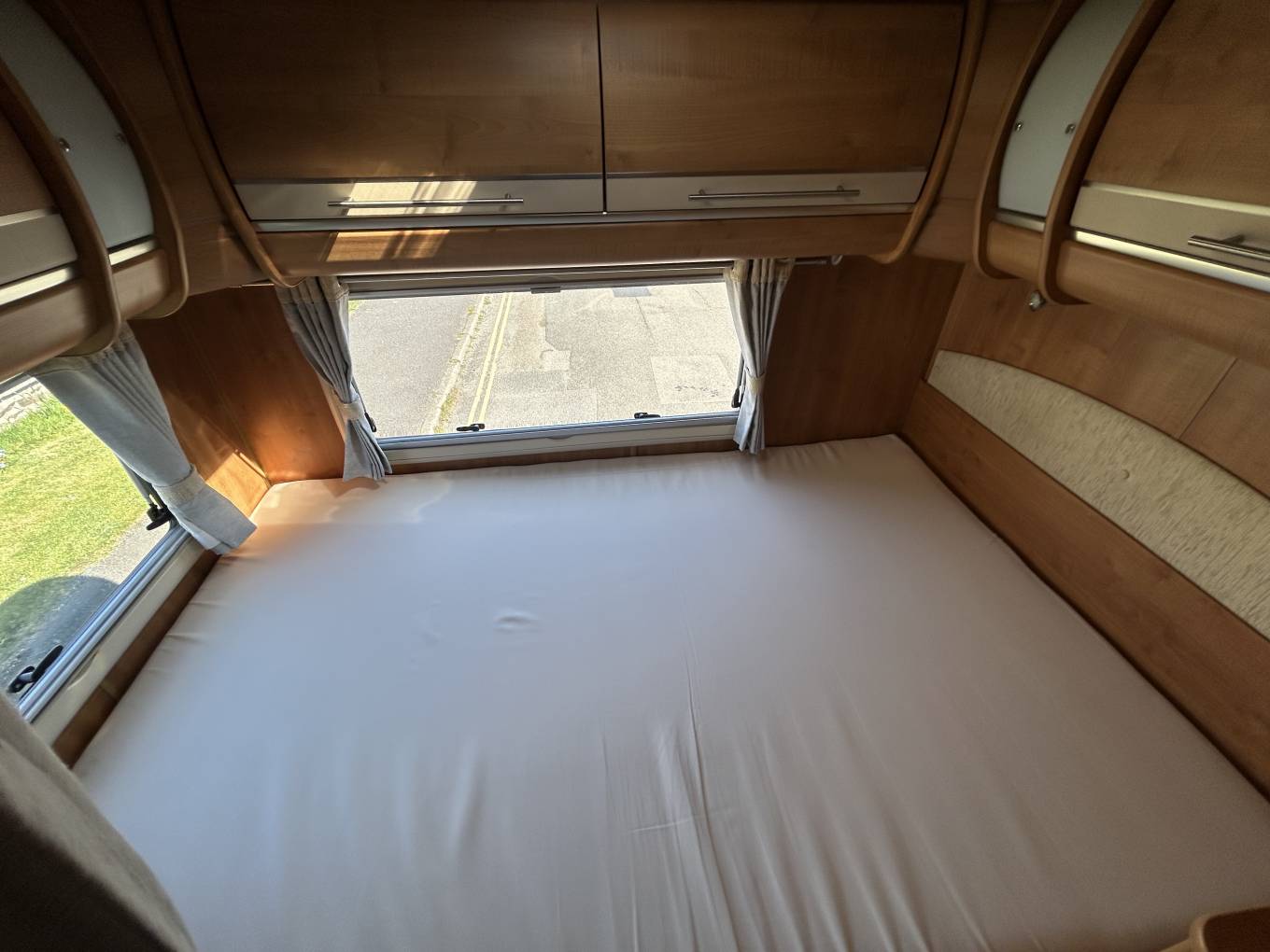 end bedroom space boasts the fixed double transverse bed with surrounding storage that sits above the garage space.