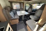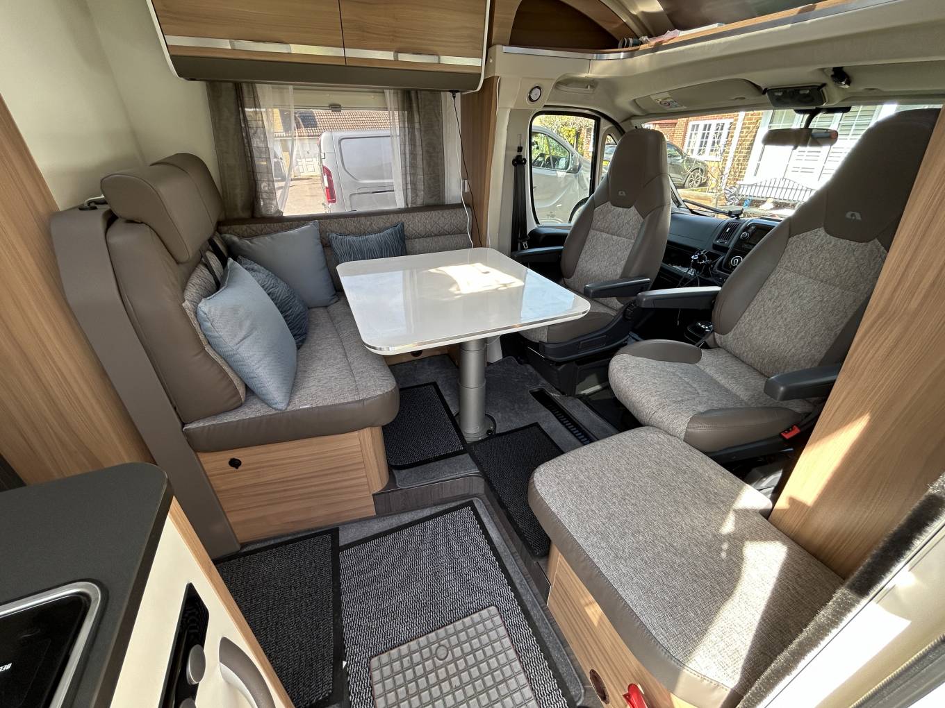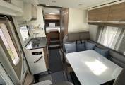 The interior is both functional and inviting and features Adria's renowned high levels of craftsmanship. Up front, the two swivel cab seats rotate to face the living area, forming a sociable lounge or dining space perfect for meals, games, or relaxing. Safety is prioritised with four seat belts, ensuring all passengers travel securely. The well-equipped kitchen includes a 142-litre Thetford fridge freezer with automatic power selection, an oven and grill and 2 gas burners.