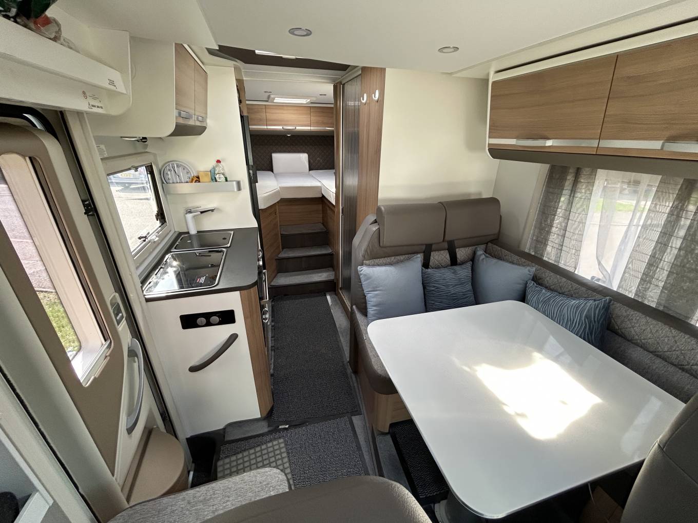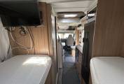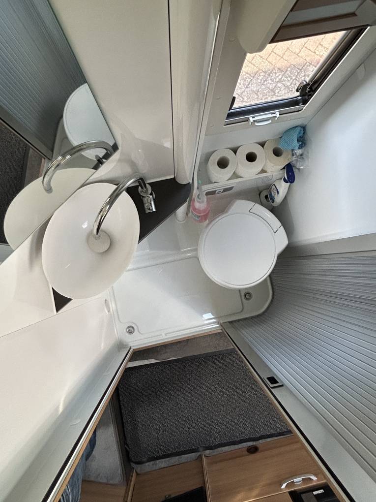 Designed to comfortably sleep four, the motorhome features a versatile sleeping setup. At the touch of a button, the electric drop-down bed effortlessly lowers from the ceiling in effect giving you a fixed bed but without taking up any of your valuable floor space. Towards the rear, a fixed bed provides additional flexibility, easily converting between two single beds or a spacious double to suit your needs. Whether travelling as a family or with friends, everyone is guaranteed a restful night’s sleep.
