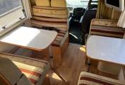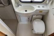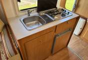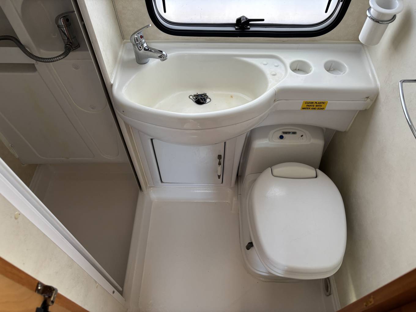 The centre kitchen is well-equipped with a sink, grill, three gas hobs, and a three-way fridge, allowing you to cook with ease wherever you are. At the rear, the washroom features a sink, toilet, and a separate shower cubicle, offering full facilities for comfortable living on the road.