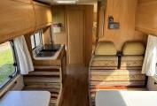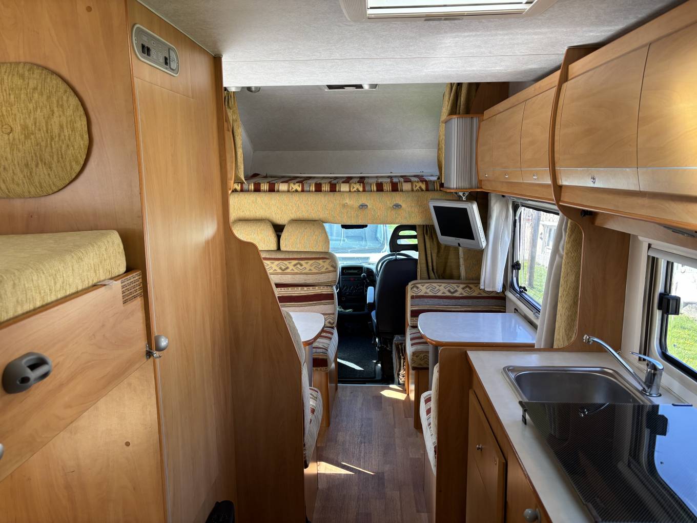 Inside, the layout has been thoughtfully designed to comfortably accommodate up to six people. Sleeping arrangements include a generous over-cab double bed, rear bunk beds running lengthways, and a convertible dinette at the front that provides two additional beds.