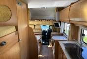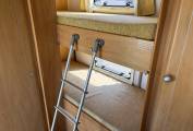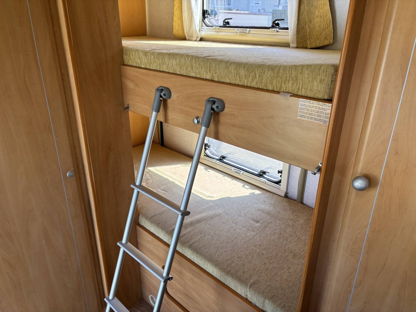 Storage is a standout feature in this motorhome, with a large wardrobe, numerous overhead cupboards, and a practical garage with side access. The lower rear bunk bed folds up to increase garage space when needed—ideal for bikes, outdoor furniture, or larger items.