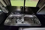 For food storage and preparation there is a fridge with freezer box, a sink, and a two-burner gas hob.