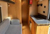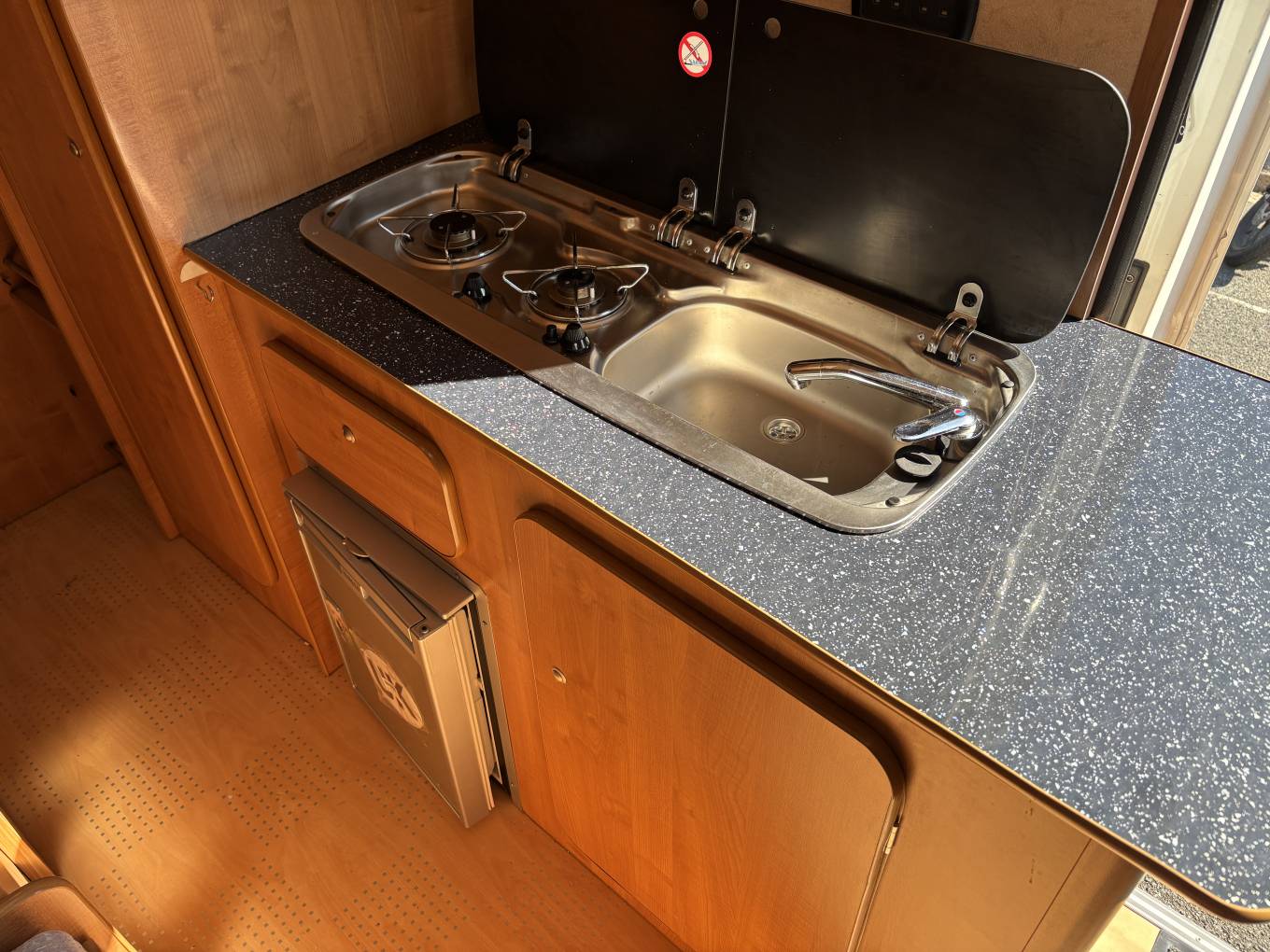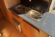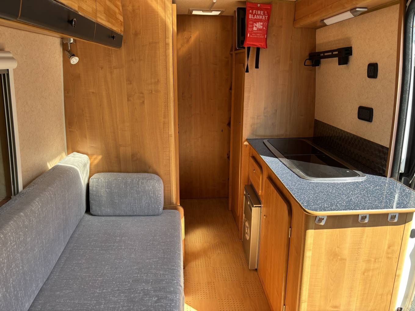 Inside, the layout is simple yet functional. The lounge area converts into a comfortable double bed, and there's a fold-away dining table for mealtimes or working on the go. The kitchen includes a sink, two gas hobs, and a fridge, allowing for easy meal prep wherever you’re parked.