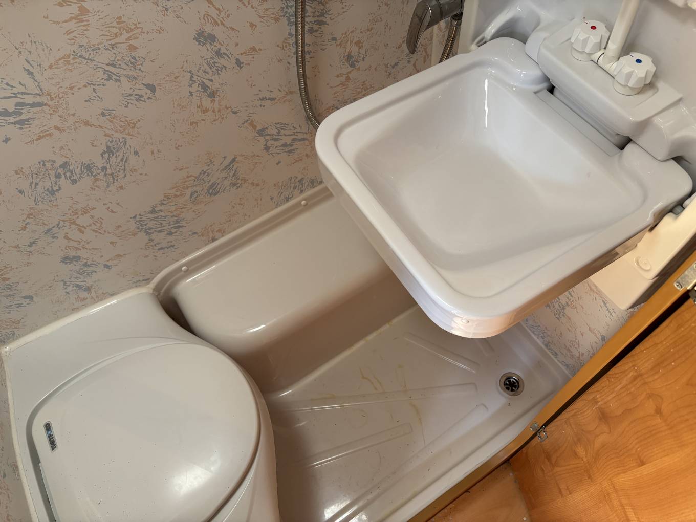 The washroom features a fold-away sink, toilet, and shower, all cleverly designed to maximise space. Storage is also well catered for, with a wardrobe, multiple shelves and cupboards, and a useful vertical garage space at the rear—ideal for outdoor gear or larger items.