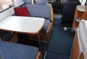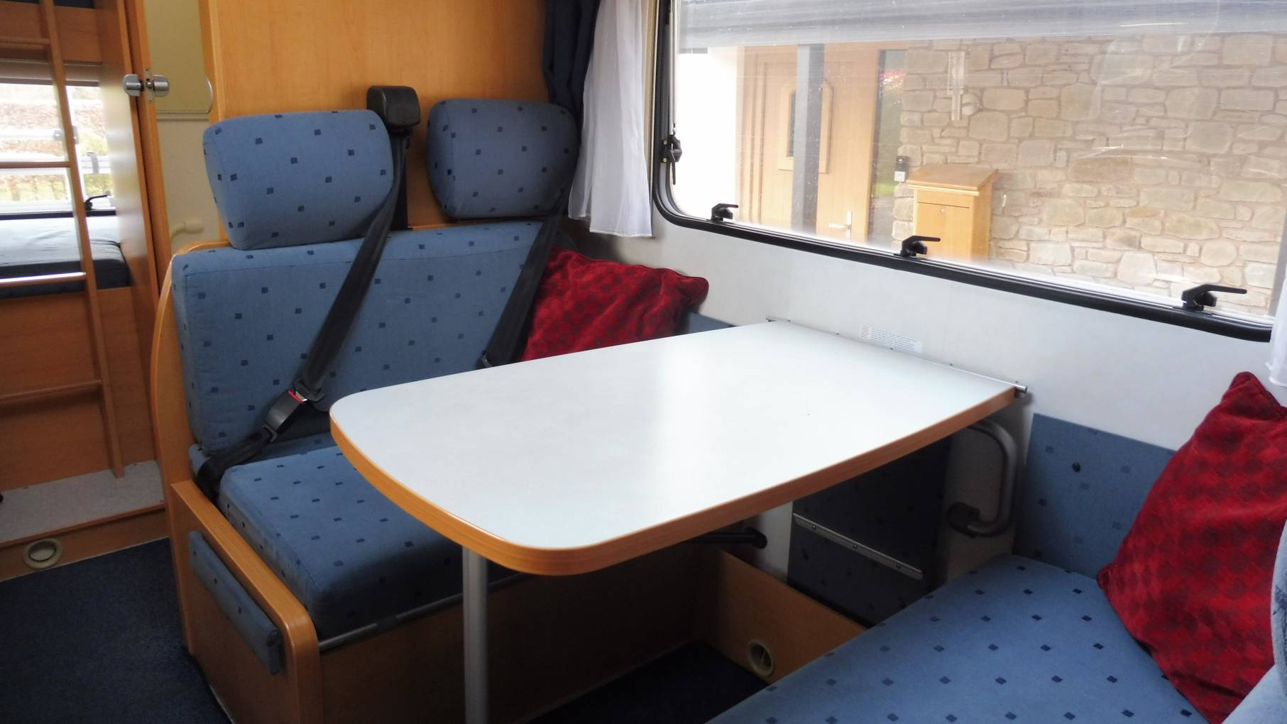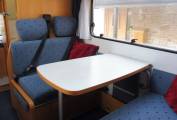 Across from the kitchen is the dinette area with 3 three-point seat belts and one lap-belt. This area also converts into a good sized double bed.