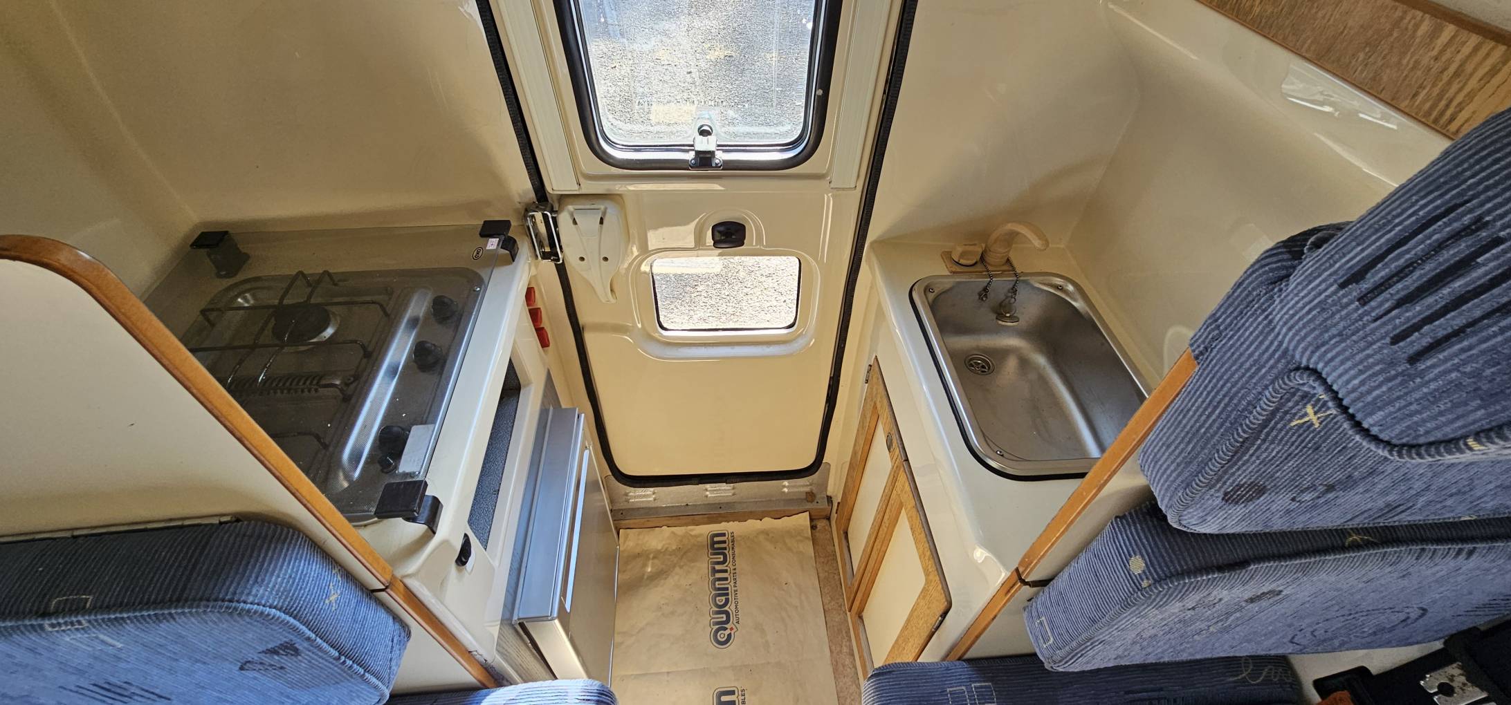 It has an end kitchen with 2 small areas dedicated to hob and sink respectively along with under located grill and 3 way fridge