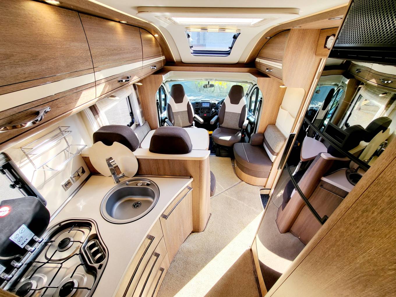 The front seating area has a forward facing 2 seater sofa with 2 seat belts and a side facing chair. Both front seats swivel enabling 4 people to dine sociably at the table which has a sliding top. This will convert into a single bed. Above is another large skylight. This motorhome has plenty of lockers to store your kit for trips and these feature very stylish handles.