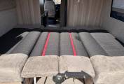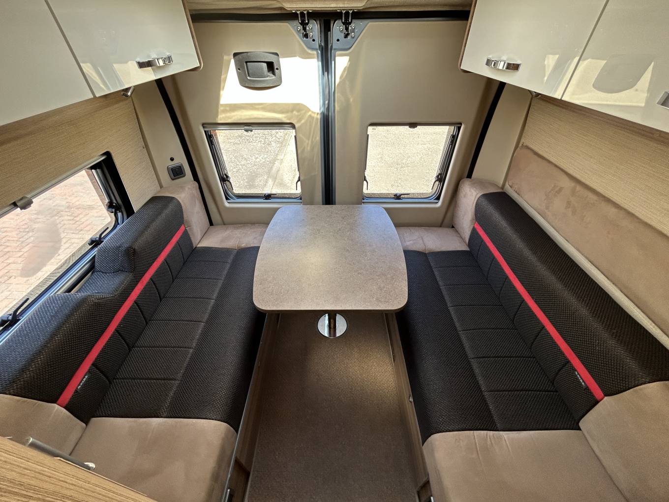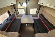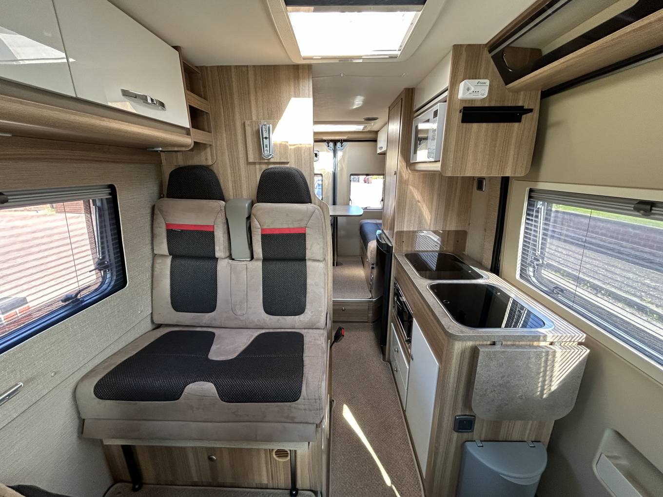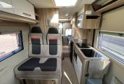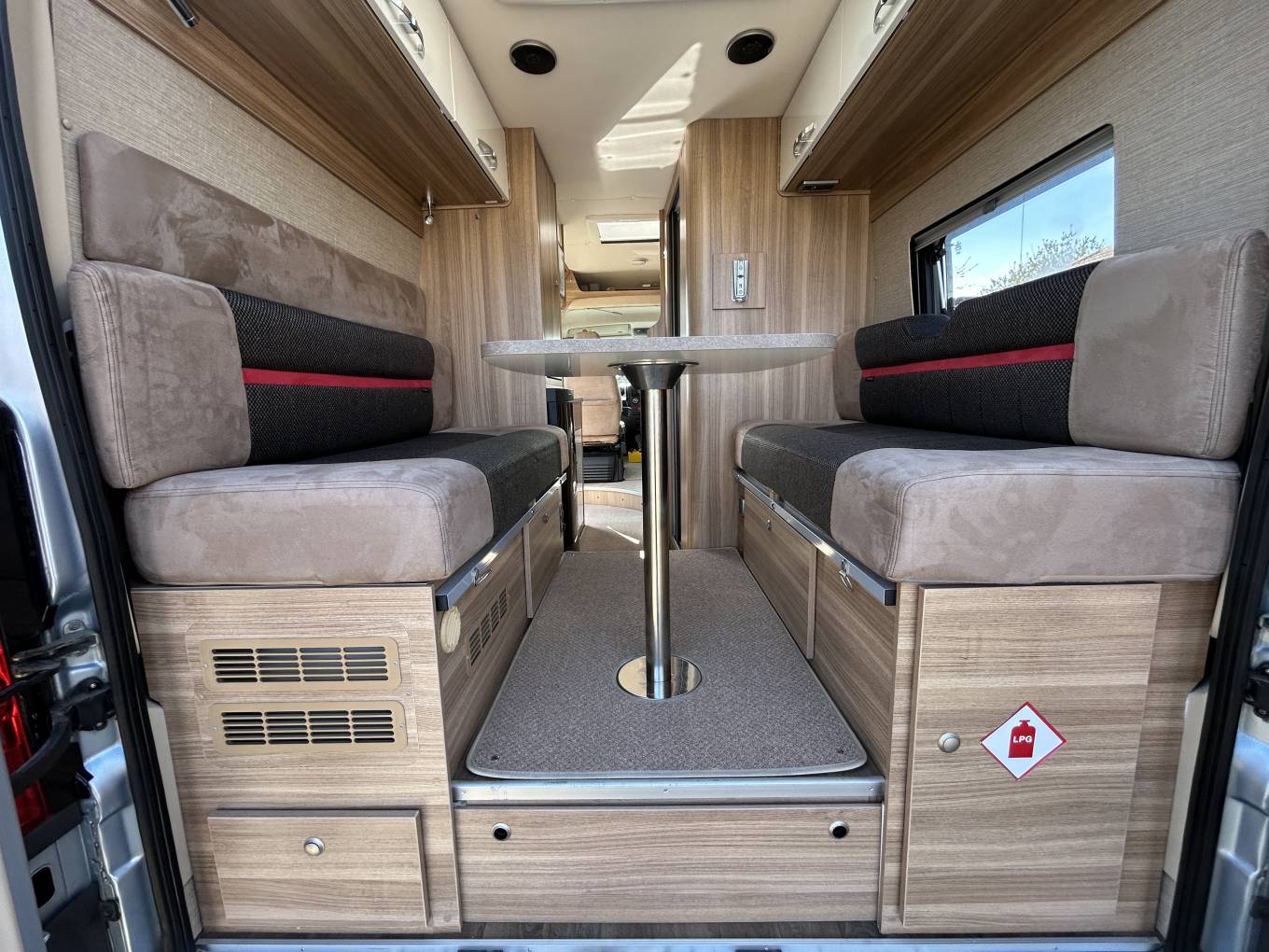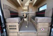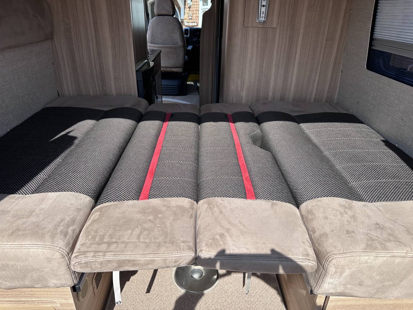 Just behind the driver's cab is a forward facing 2 seater chair with 2 seat belts so 4 people can travel safely in this campervan. There is another dining table that fixes onto a side rail meaning that this Autocruise has 2 dining areas. Both front cab seats swivel so for people can gather together in this part of the vehicle for drinks, food or to play cards. There is a 3rd sleeping berth which is created by extending the 2 seater chair and swivelling the driver seat around. This is perfect for a child or an adult that isn't too tall.