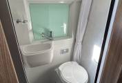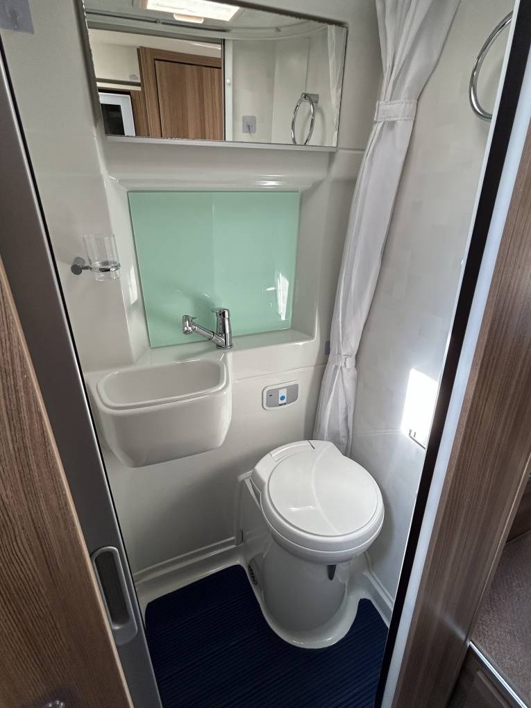 On the opposite side to the kitchen is the washroom and here you have a Thetford cassette toilet with electric flush, a wash basin and mixer tap that doubles up as a showerhead, a large mirror and a skylight.