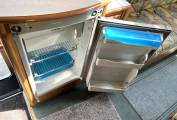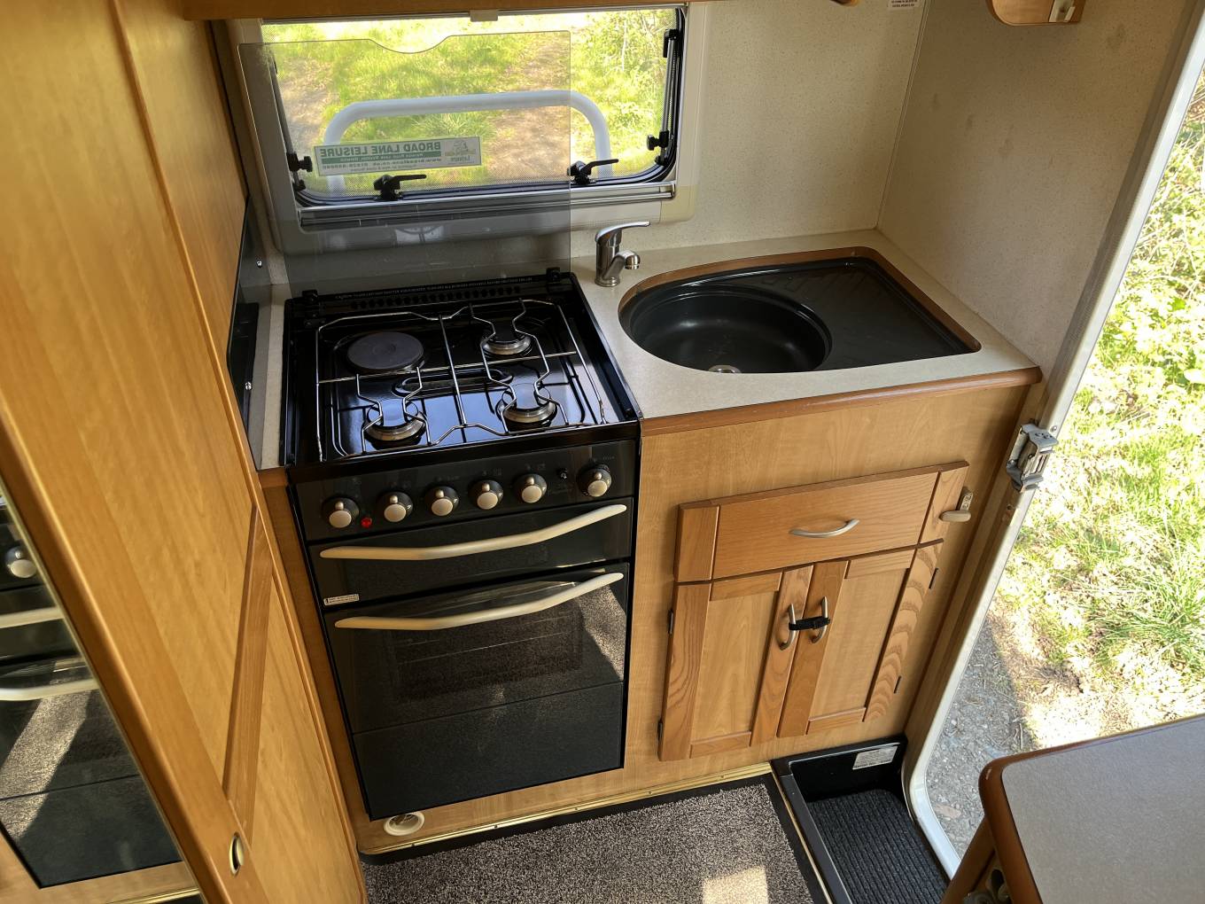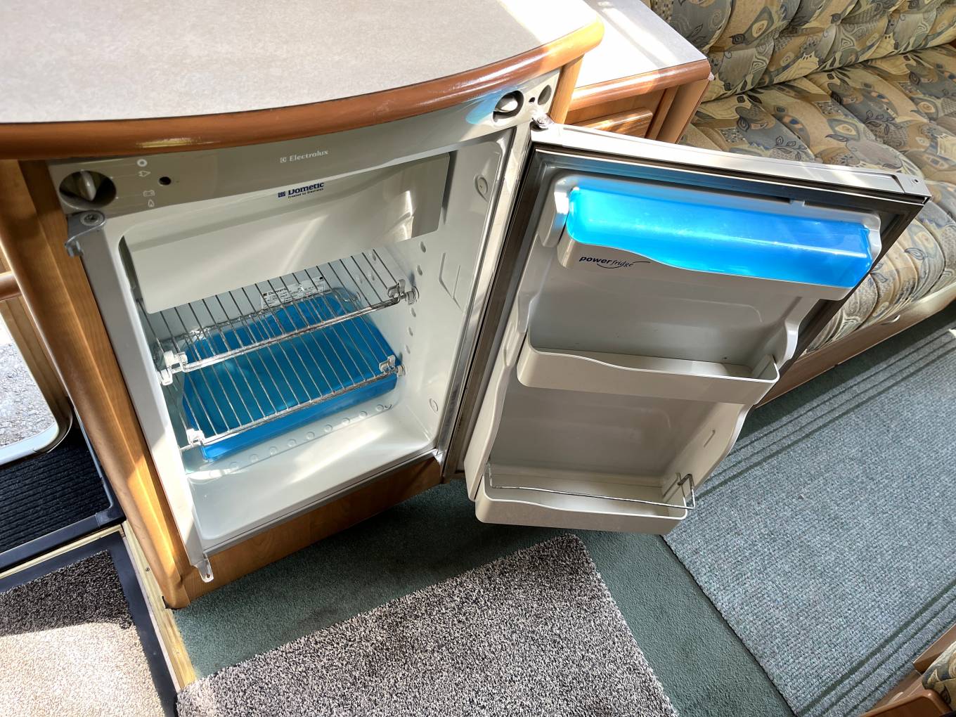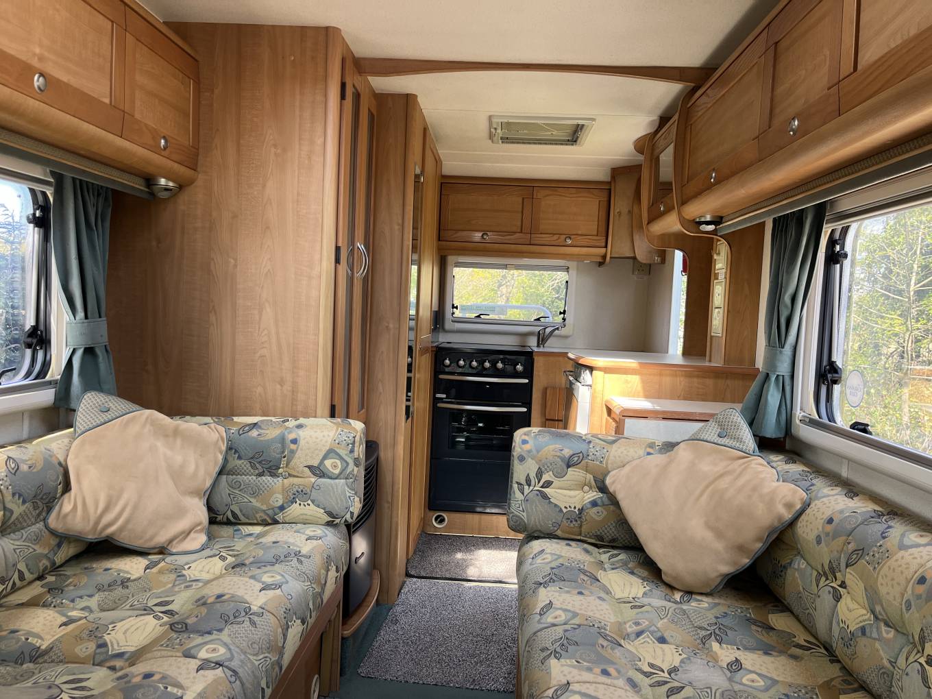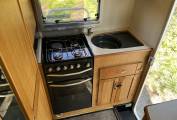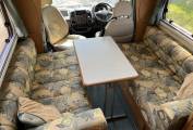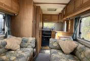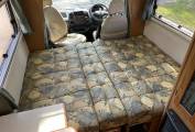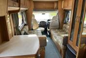 The layout is you enter the rear side door to the right you have a well equipped kitchen with sink, drainer, oven, grill and dual fuel hob. The kitchen also offers you plenty of storage with cupboards below and overhead with a fridge with freezer and roof mounted 12V Omnivent Extractor with in/out setting. To the left of the kitchen is a spacious washroom with sky light and window, next to the washroom is a tall wardrobe. Moving to the front is the lounge area that is a really good size with two opposing side sofas to relax in with an occasional table this also easily converts to a large double bed in the evening. The passenger seat swivels round to expand the seating in the living area.