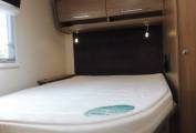 The rear of the motorhome can be partitioned with a sliding wooden door and features a French bed with storage under, alongside which there is a vanity sink unit with shower compartment and cassette toilet.