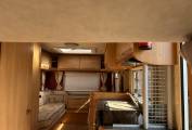 On the right of the van there is a well equipped kitchen with a oven and grill, duel fuel hob, microwave, fridge and plenty of locker and cupboard space for cutlery and crockery etc.