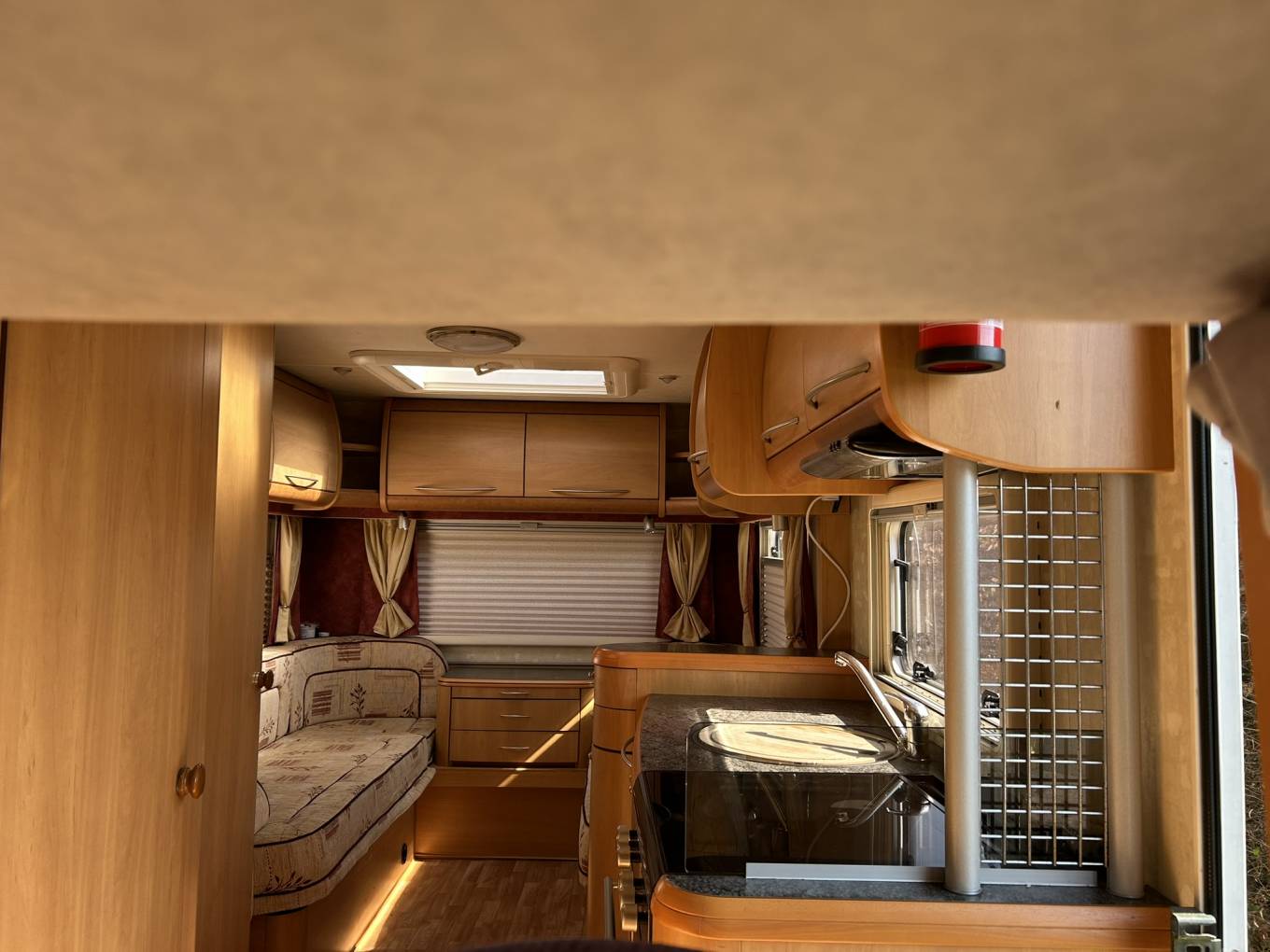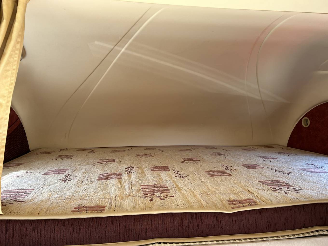 The overcab bed is accessed by a ladder and comfortably sleeps 2, there are two windows and lighting. All windows have fly screens and black out blinds. There is a wardrobe with hanging rail.