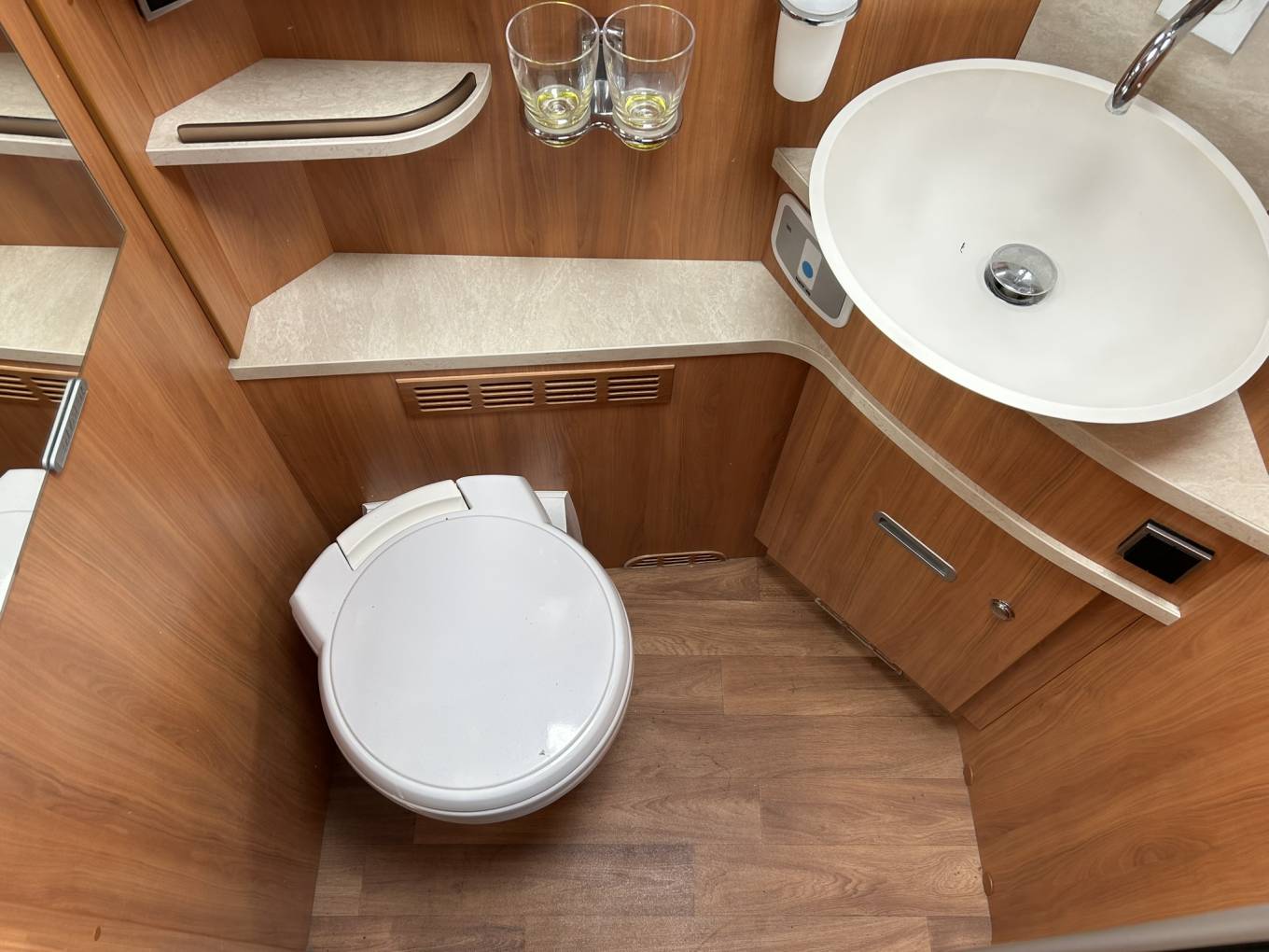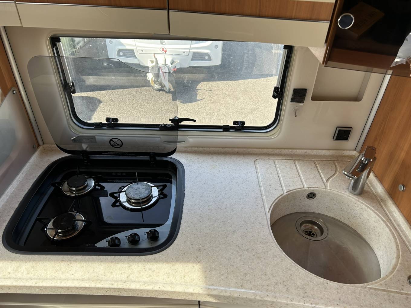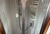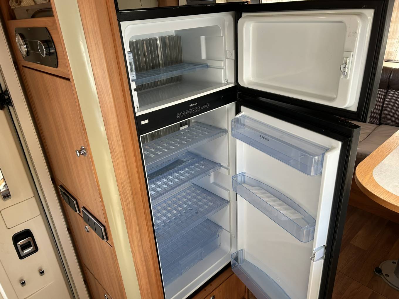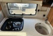 The kitchen has all the usual features including a large fridge freezer, oven and grill, 3 ring hob, sink and drainer and a drop down coffee machine. There are lots of drawers, all with soft closures and locks to keep them from opening during travel. There is also cupboard space above for crockery etc.
