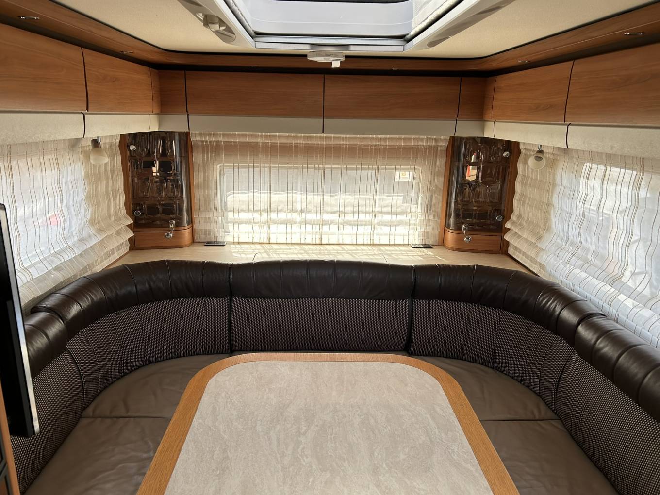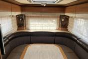 The rear of the van boasts a large U shaped lounge with plenty of comfortable seating and a fixed table, ideal for entertaining. There is a large shelf at the back and a small storage box which the current owners use to store their laptop and cables. There are plenty of sockets to plug in lamps and chargers and an enormous amount of storage in the underfloor compartments as well as the interior cupboards.