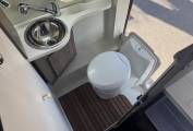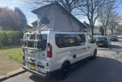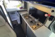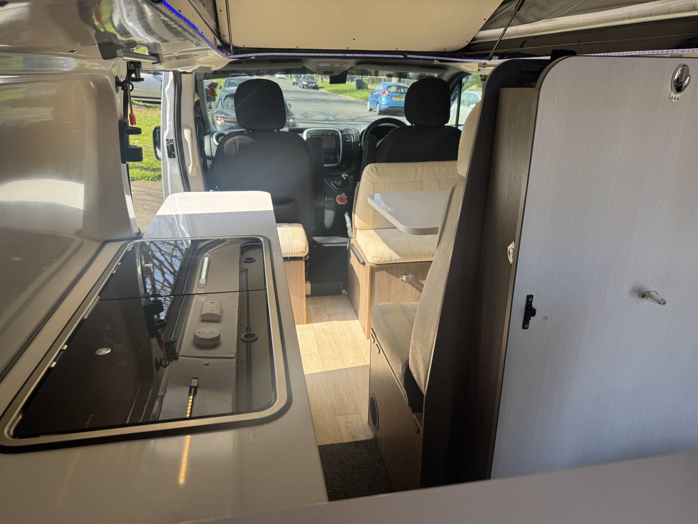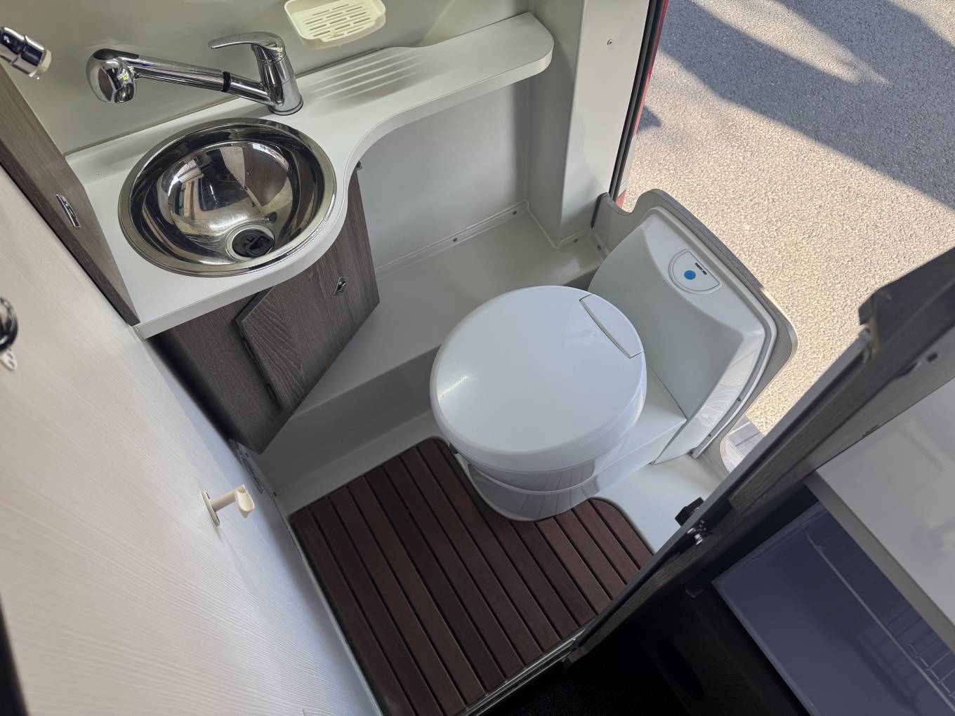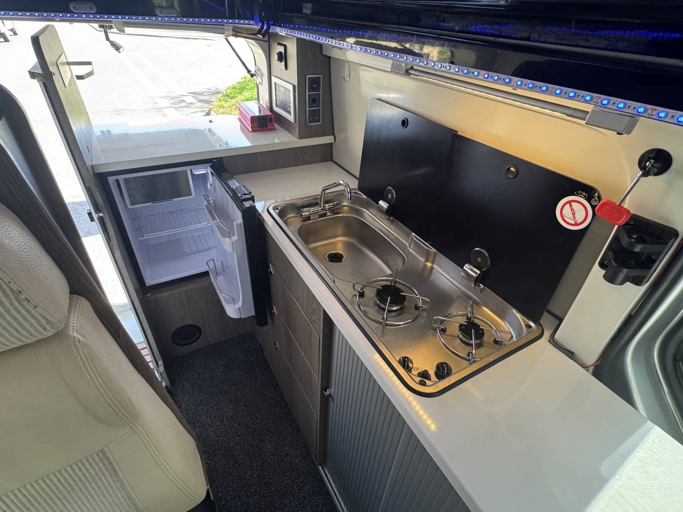 At the rear, you’ll find a well-appointed toilet area with a Thetford swivel toilet, washbasin, and generous storage, along with a ladder leading to a spacious and comfortable overhead bed. The kitchen is both practical and stylish, featuring a stainless steel sink, a 2-burner gas hob, and a 12V fridge. Also in this area is the inverter which can convert 12v to 230v power, excellent for charging devices or using electrical items such as hairdryers and microwaves when not on hook up.