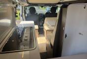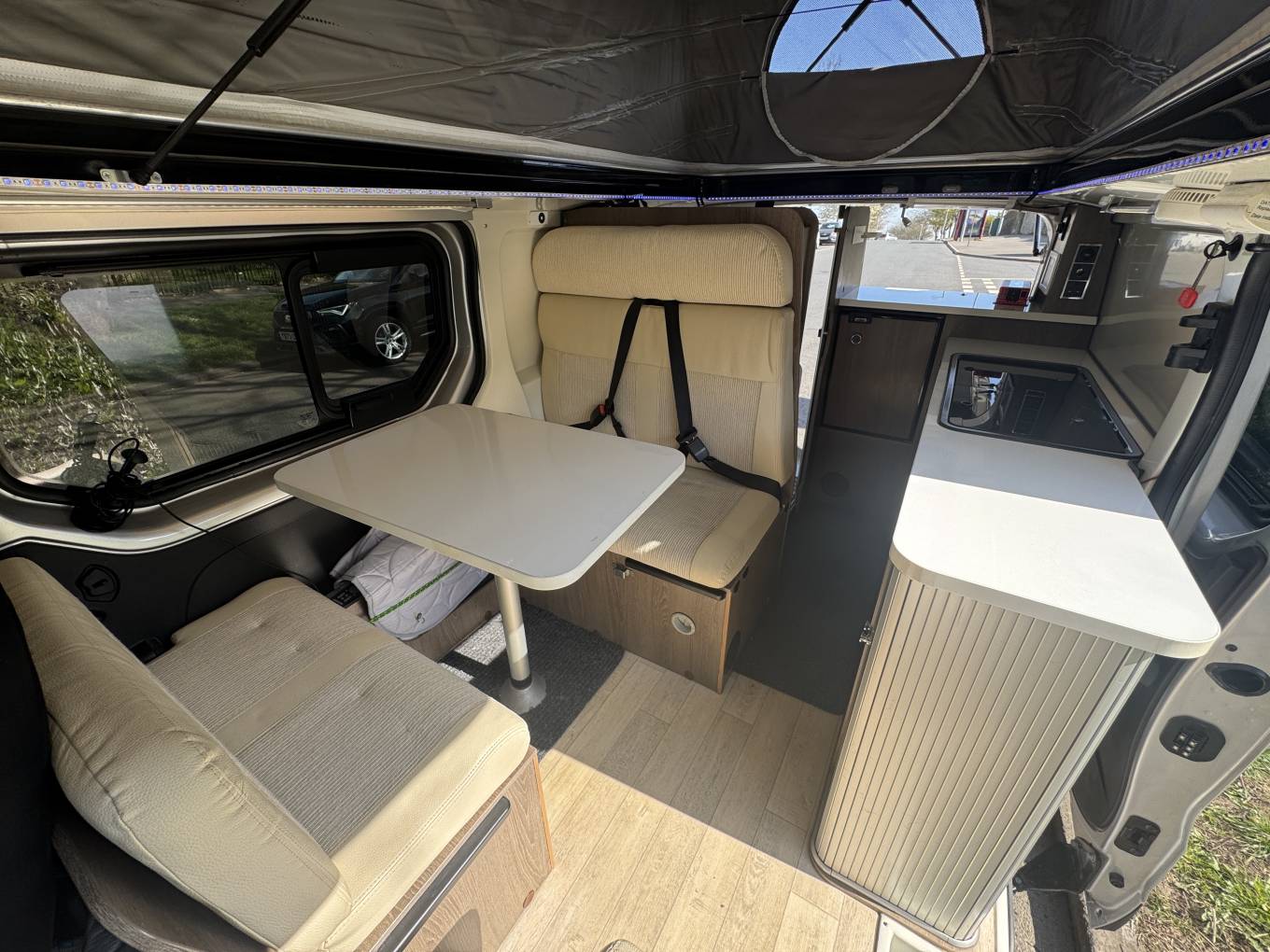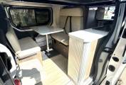 The lounge area offers versatile seating with two forward-facing seats equipped with 3-point seat belts, an adjustable table, and swivel seats for the driver and passenger. This area can easily convert into a double bed, providing the fourth berth in the camper.