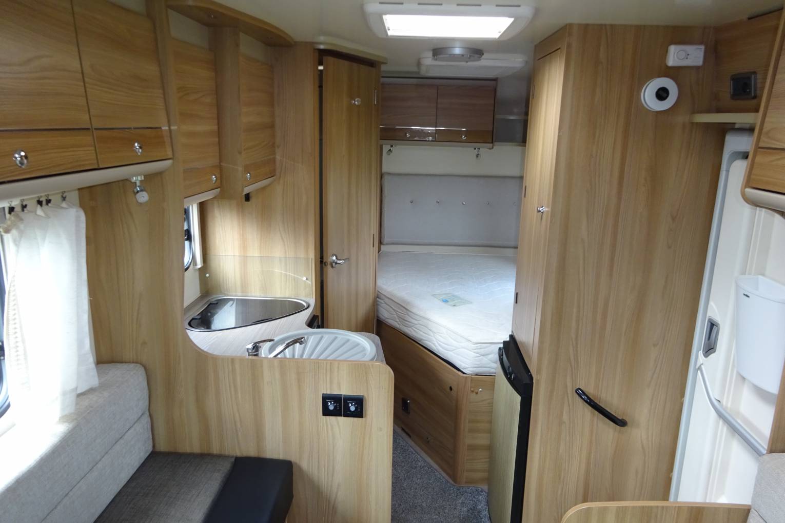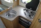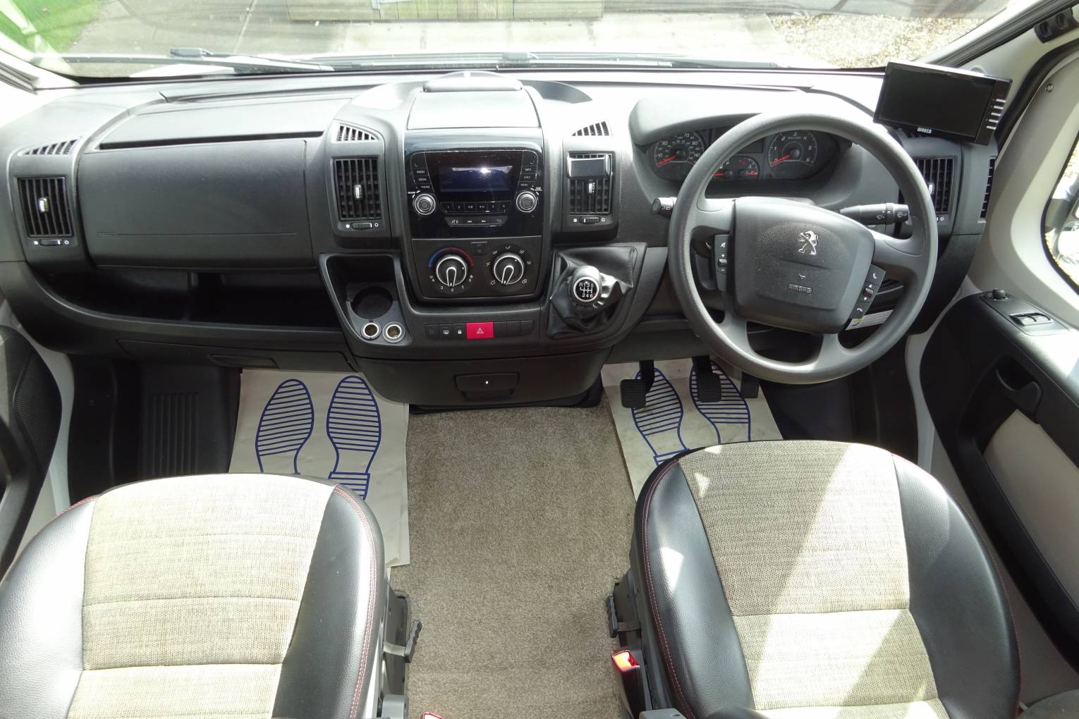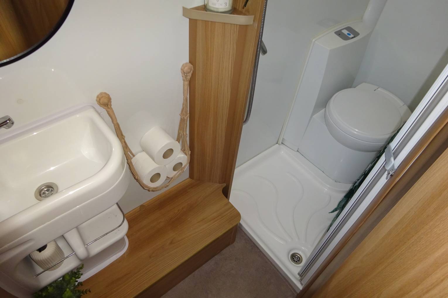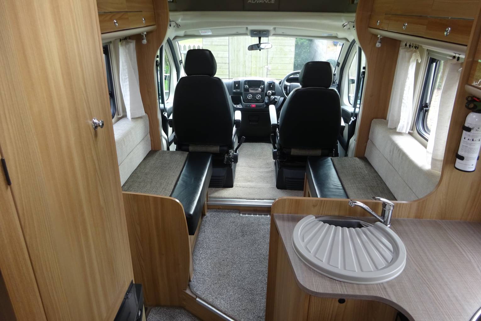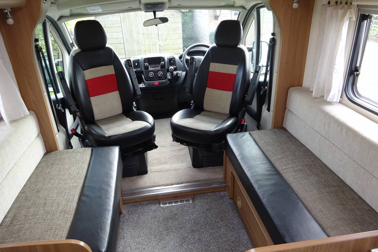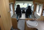 As you step inside you get a real feel for the light and airy feel of this motorhome and the good use of space. You immediately notice that the inside is as well presented as the exterior of this motorhome. At the front of the motorhome there is a seating area for 6 including 2 captains chairs. The seating area easily makes up in to a good size double bed. You then come to a very nice, well equipped kitchen, fitted out with an oven, grill, 3 burner gas hob, microwave, sink and a fridge with ice box. There are plenty of storage cupboards and compartments throughout the living and kitchen areas, including a large wardrobe and garage, allowing you to bring everything you might need. Towards the back of the motorhome there is a French bed. On the opposite side is a good sized bathroom fitted with a toilet sink and separate shower, all in immaculate condition.
