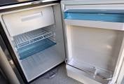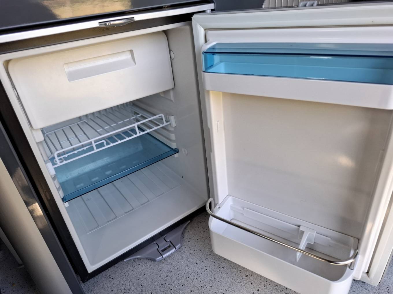 For food storage and preparation there is a fridge with freezer box, a sink, and a two-burner gas hob.