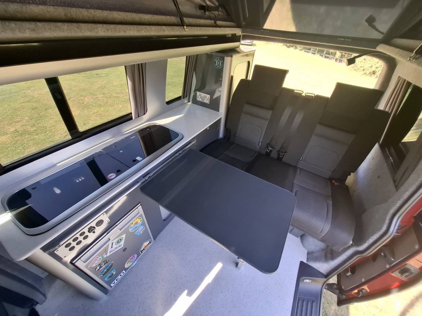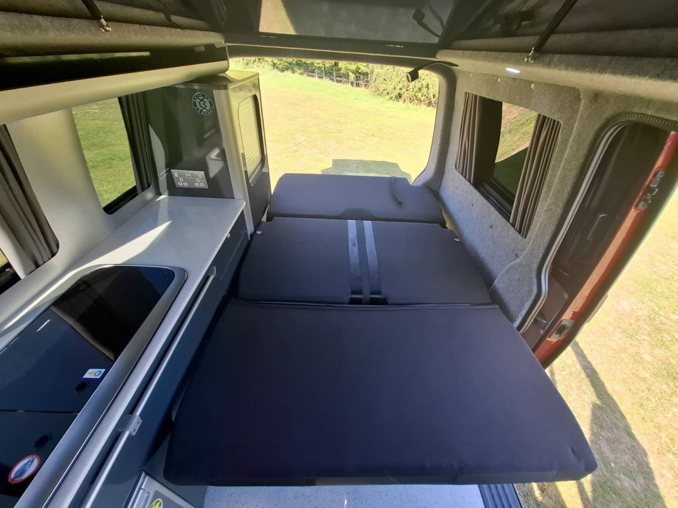 For comfort at bed time the rear seating converts to a rock’n’roll bed, with two additional berths available on the drop down roof board and mattress in the tented pop top.