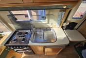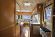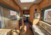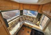 Inside, the layout offers 2 berths and 3 belted travel seats. At the rear, an L-shaped lounge converts into a double bed (approx. 6ft 1in x 4ft 5in). Large windows make it bright during the day, and curtains ensure comfort at night. Overhead lockers and cab storage provide plenty of room for your belongings.