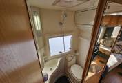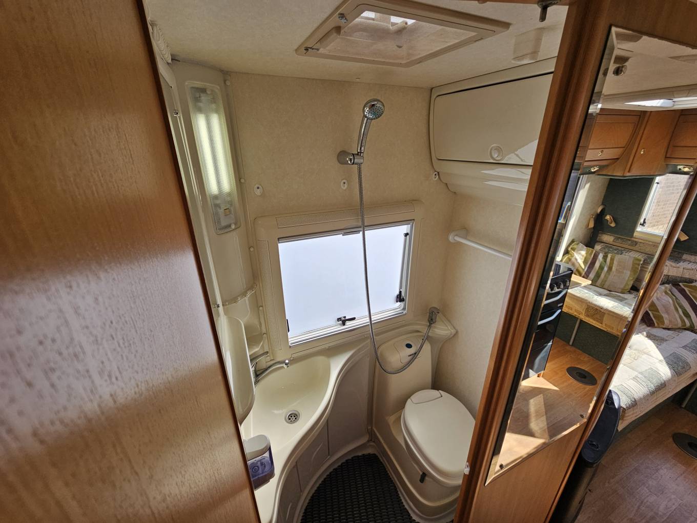 The washroom is compact but functional, with a cassette toilet, sink, and shower. A rooflight adds ventilation and natural light.