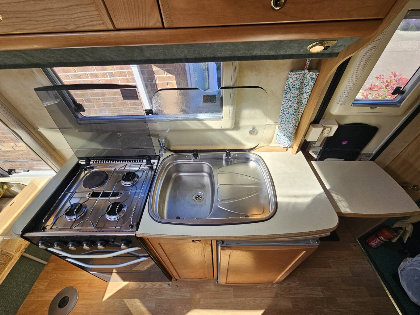 The kitchen includes a fridge with freezer compartment, three-burner gas hob, one electric hob, oven, grill, sink with mixer tap, and a fold-out worktop extension for added prep space.