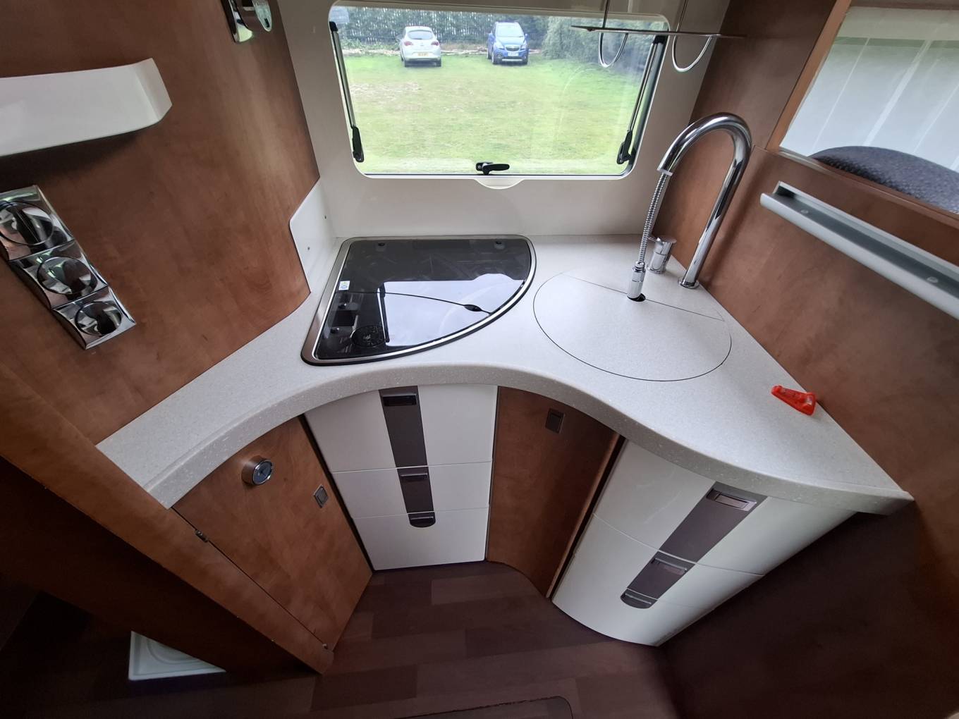 In the centre of the vehicle is the nearside kitchen, with a 3-burner gas hob, a sink, and opposite, a separate fridge and freezer, and a combination oven/grill.