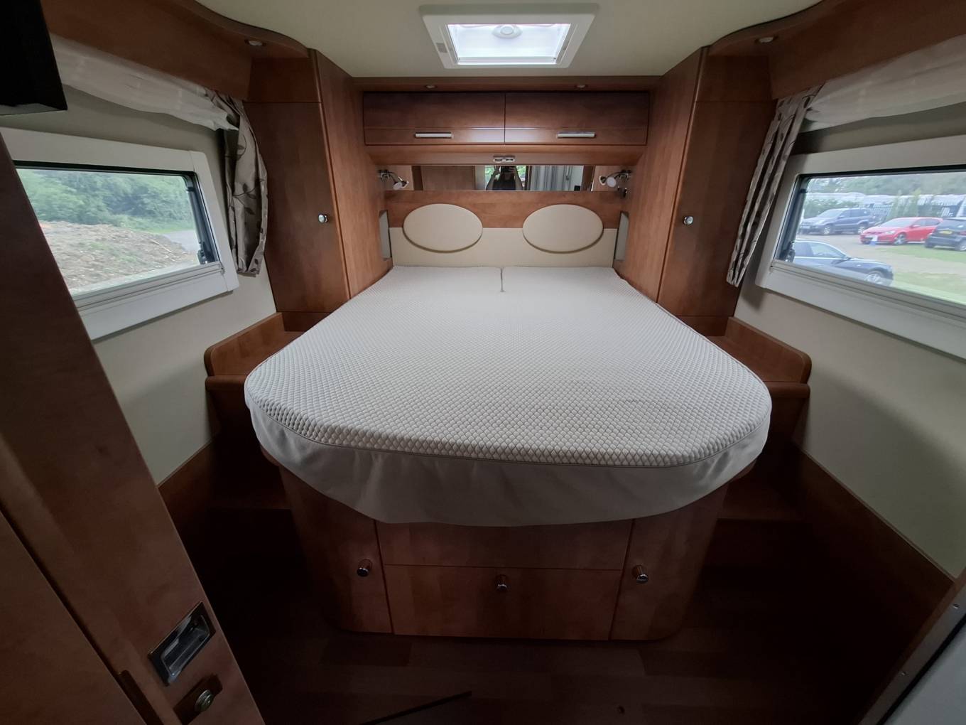 The rear island double bed is positioned above a large garage that can be accessed from the rear of the vehicle on both sides.