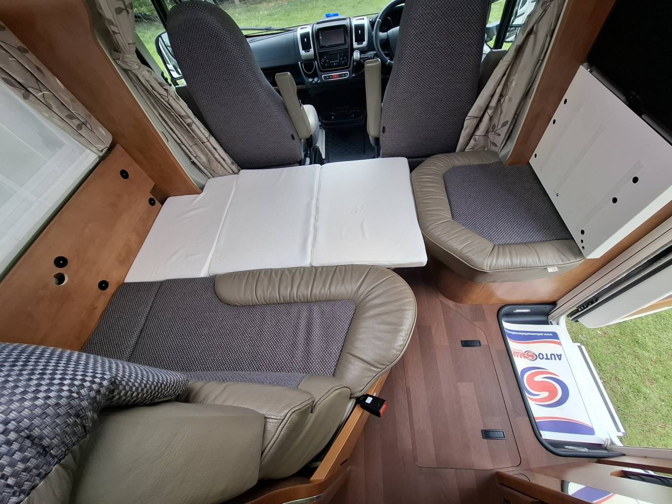 Behind the cab is a L-shaped lounge (which includes two additional forward facing seat belts), that, when used with the bench sofa seating opposite and the two swivel cab seats, provides a great space for dining and entertaining around an adjustable table. This area can be converted into an additional berth as required.