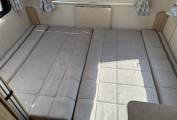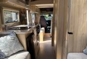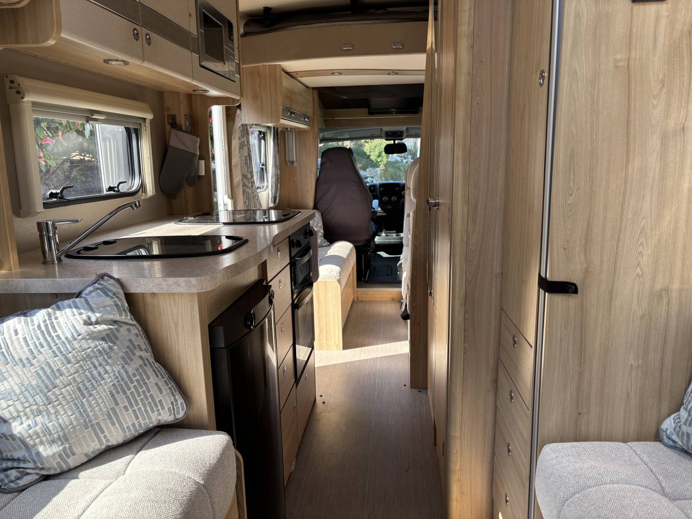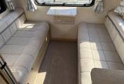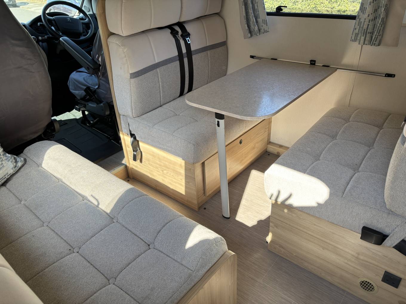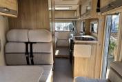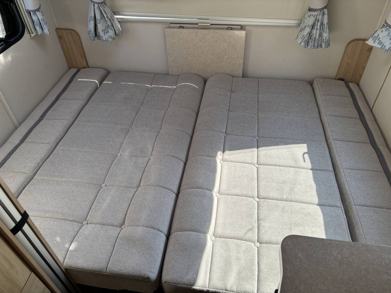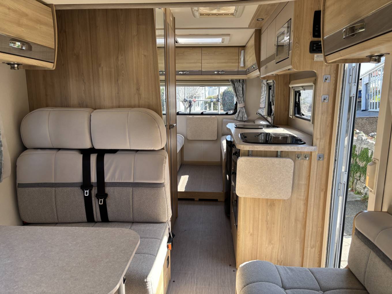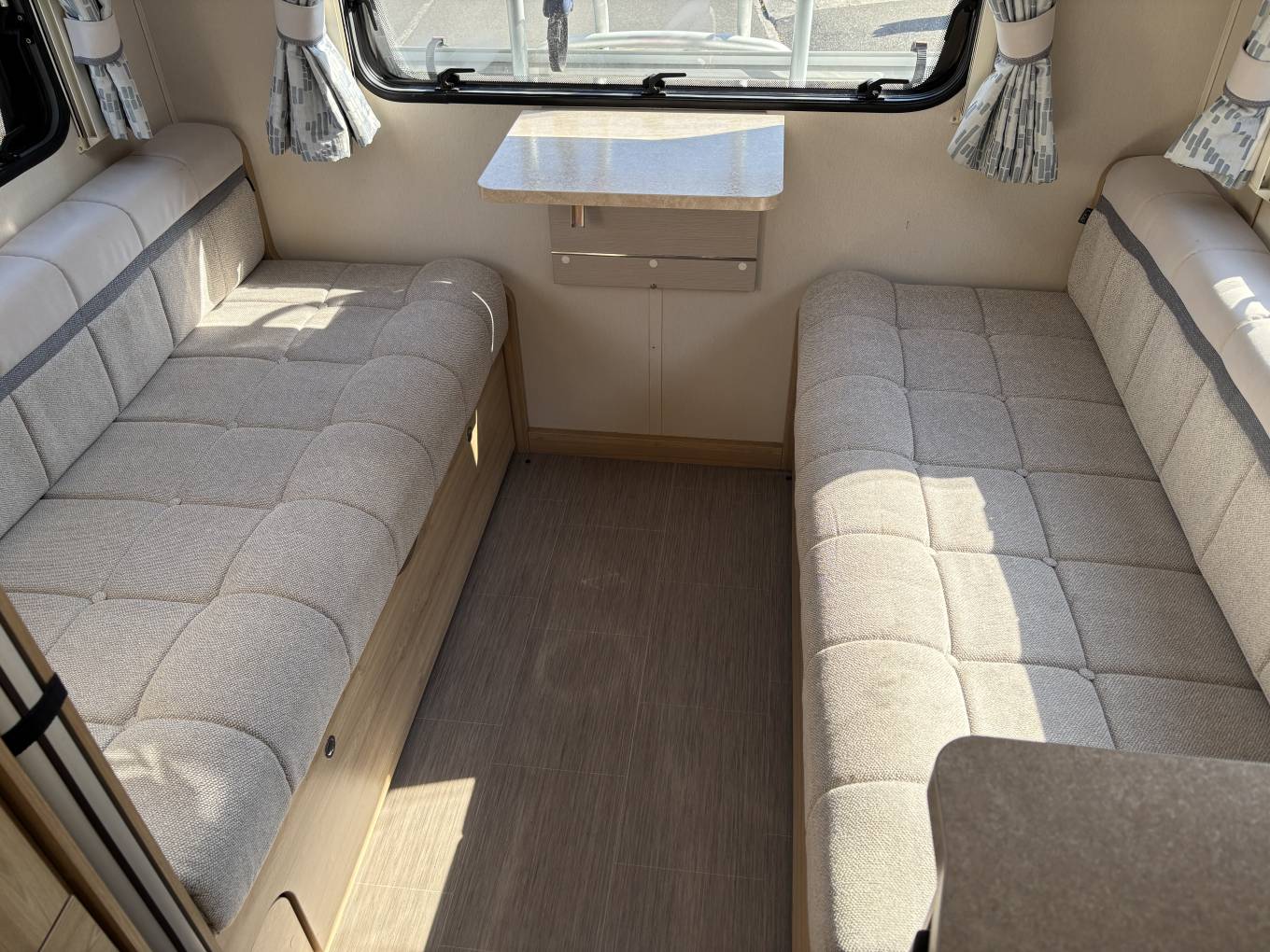The standout feature of the GT 196 is its clever layout. At the front is a spacious dinette with four belted travel seats and a large panoramic window, creating a bright and sociable space to relax or dine. Above, a drop-down double bed lowers electronically, providing a quick and easy sleeping area without compromising floor space.