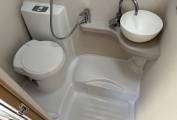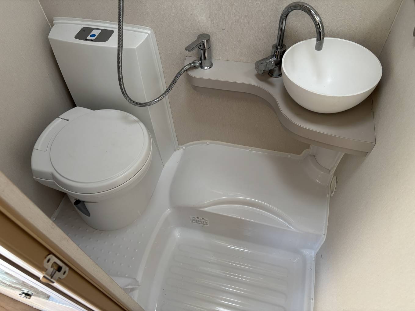 The central kitchen is fully equipped with a grill, oven, three gas hobs and one electric hotplate, a microwave, fridge with freezer compartment, and a sink—everything you need for comfortable living on the road. Opposite is the washroom, featuring a cassette toilet, basin, and a shower, designed to make the most of available space.