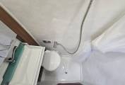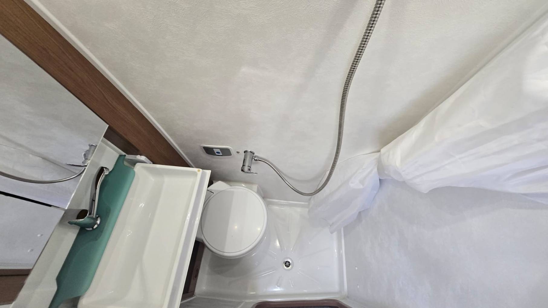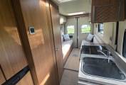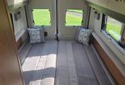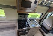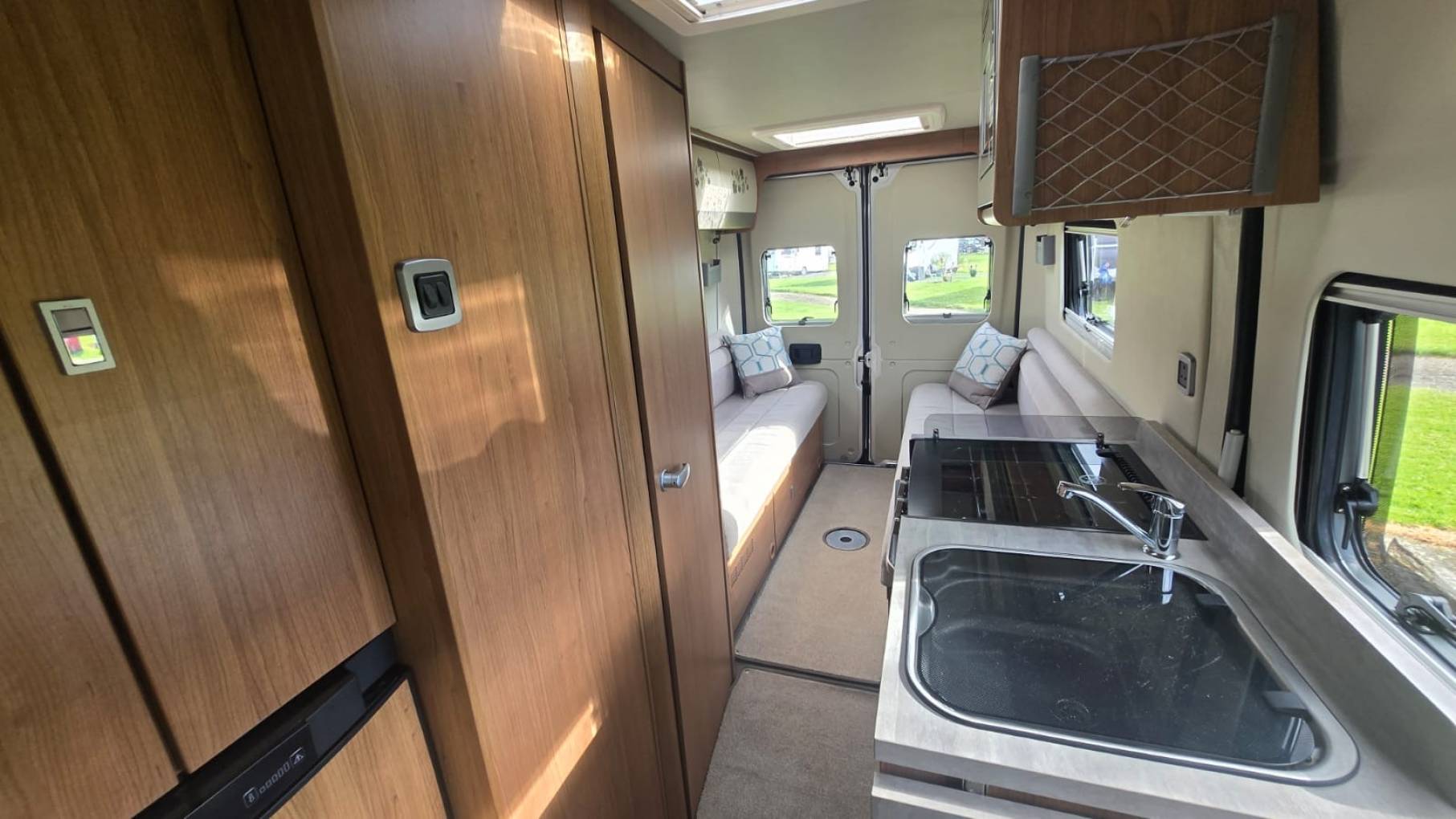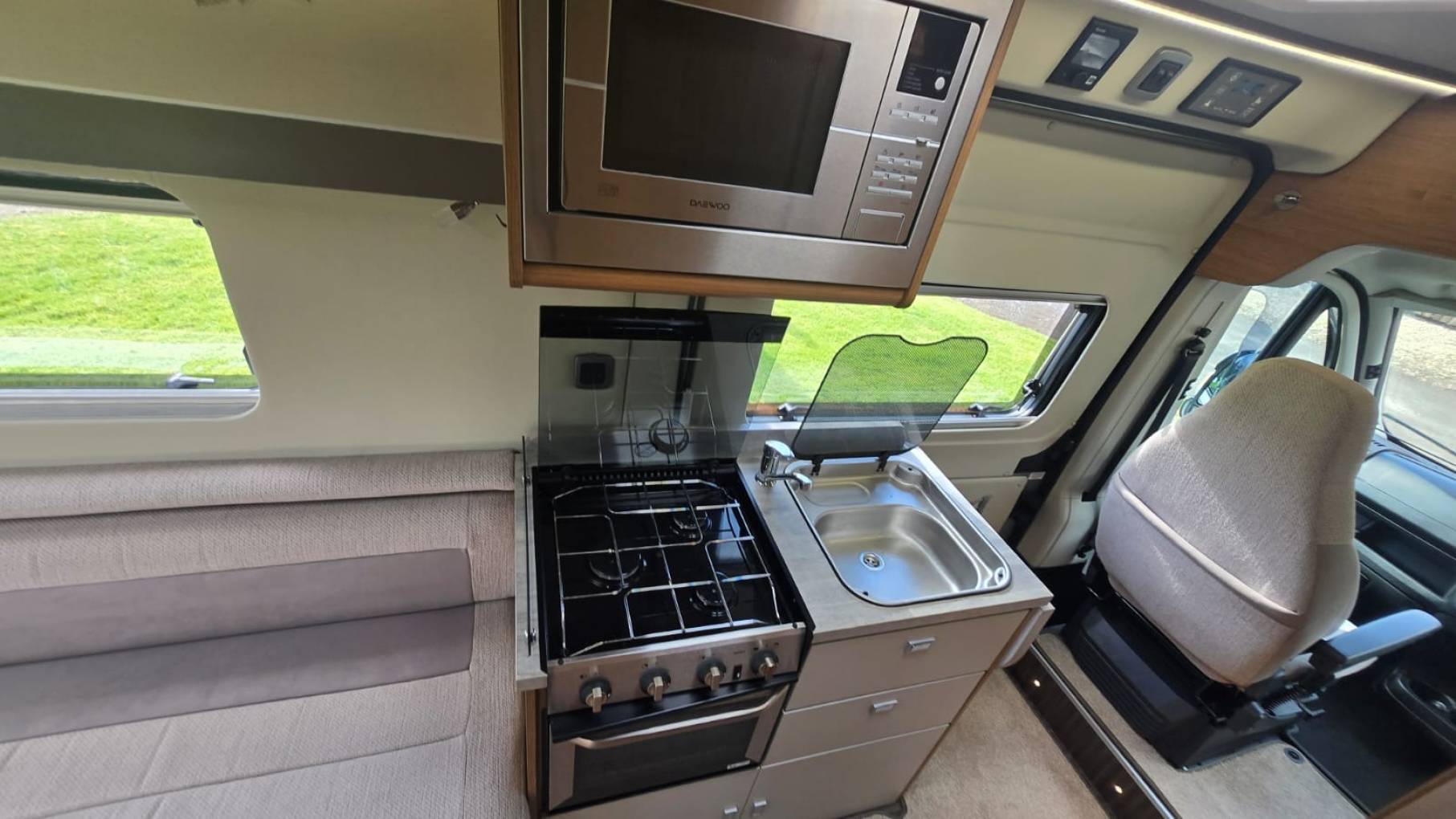 From the rear there is side facing lounge seats that can be used as two full length singles or a full transverse double bed with a retractable table available when needed for relaxing or dining. The washroom is as good as it gets even for much larger motorhomes, the fully lined shower cubicle is of a size that makes it practical to use. Storage is impressive with overhead lockers and functional drawers and cupboards. The kitchen area is again as good as a large motorhome with a fitted Daewoo microwave, 3 gas burner hob, oven and grill, 3-way fridge with small freezer and modern silver sink.
