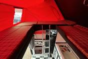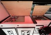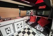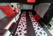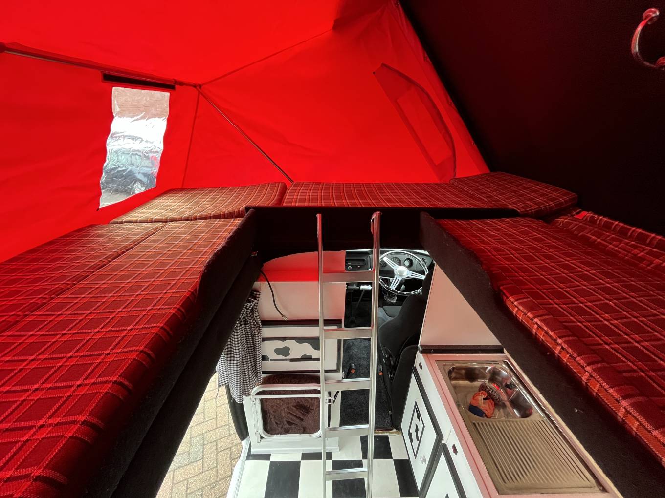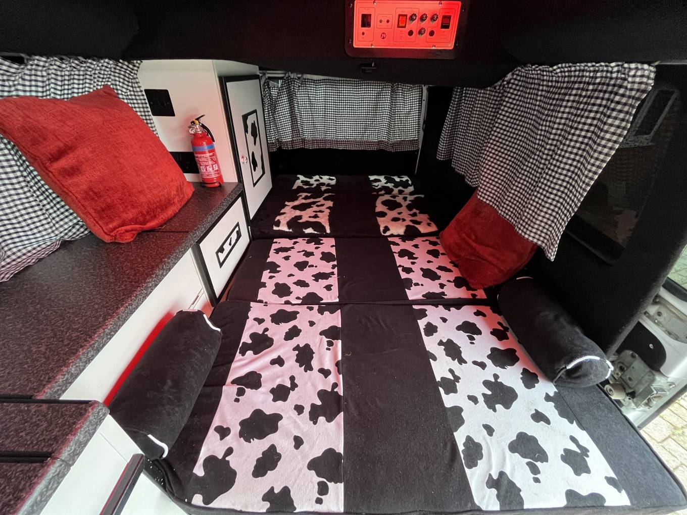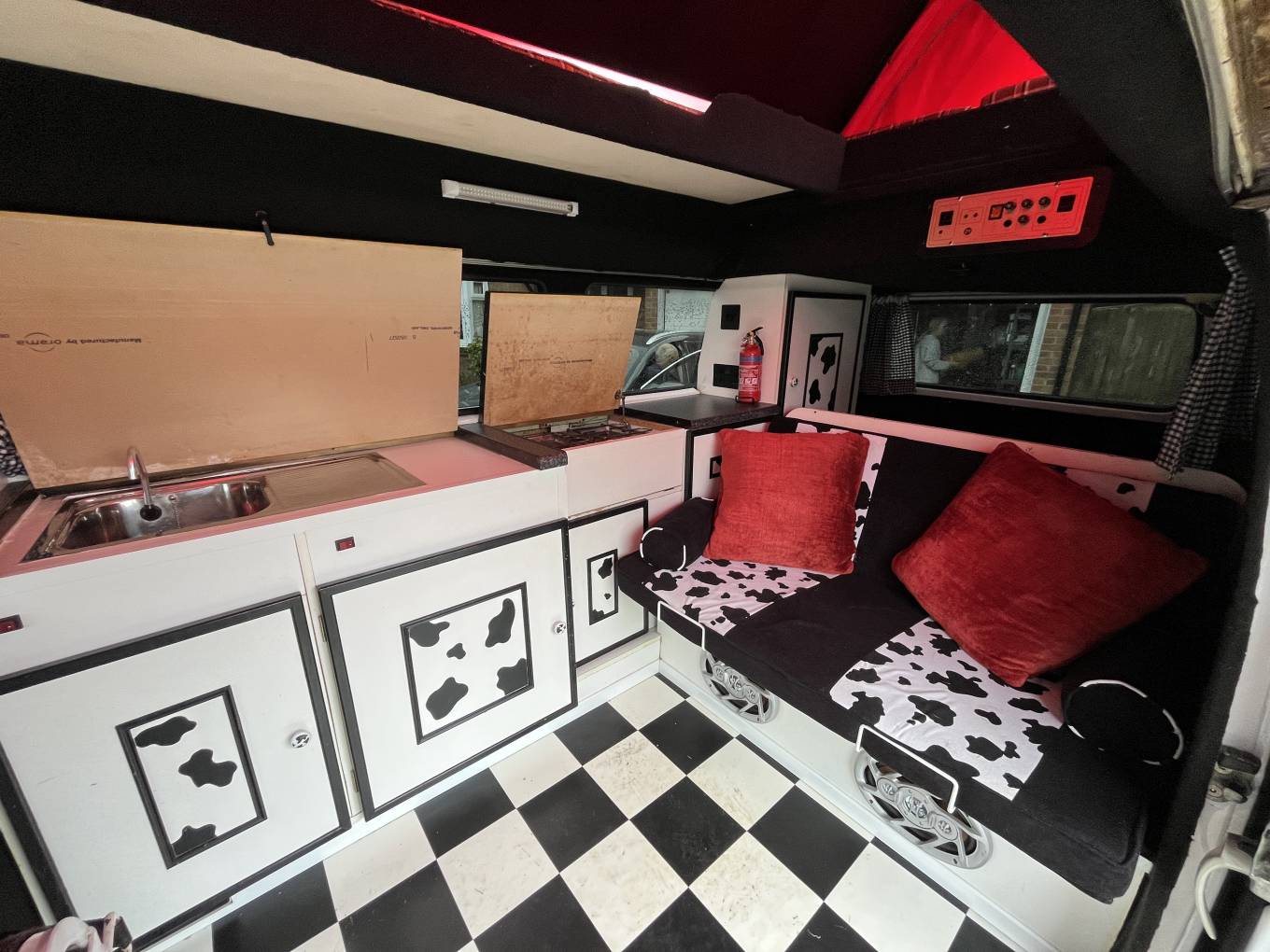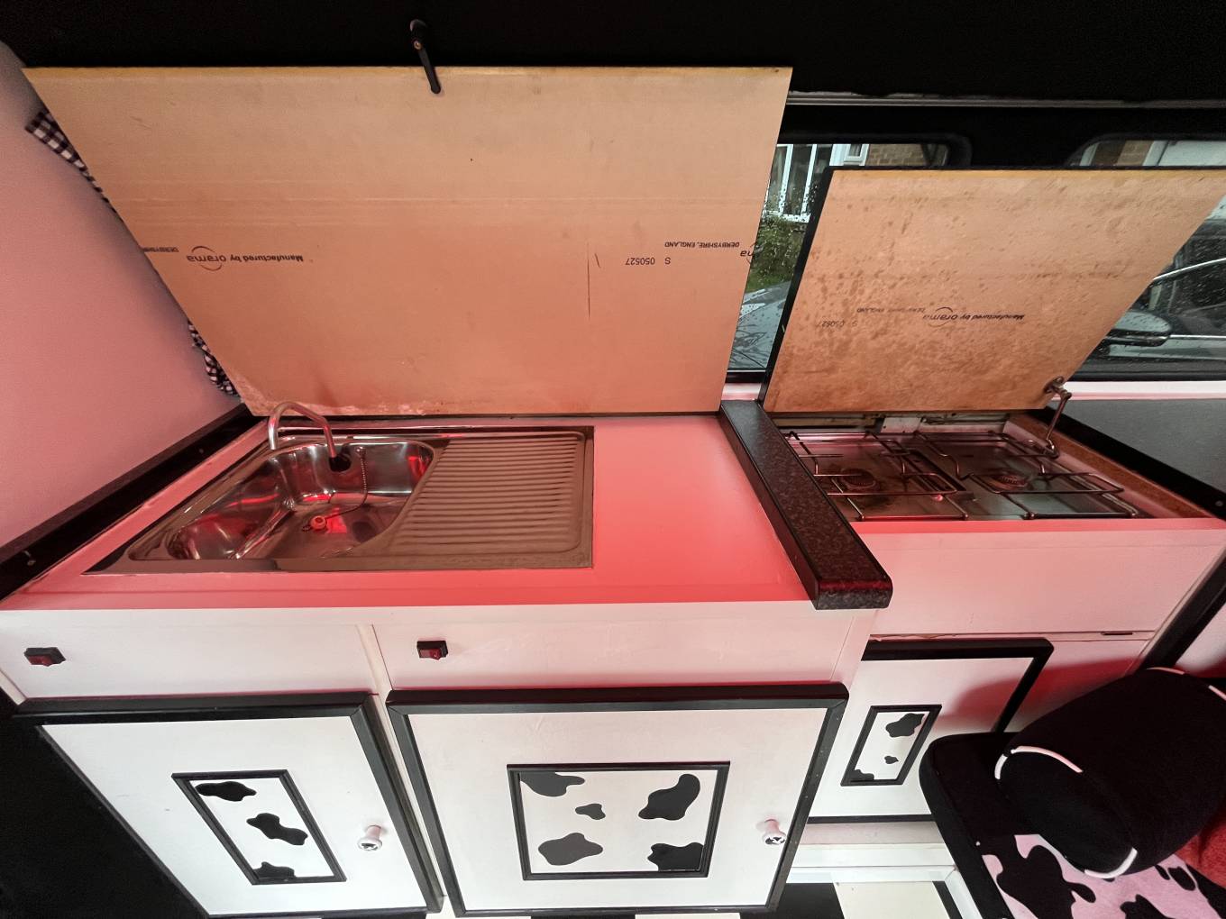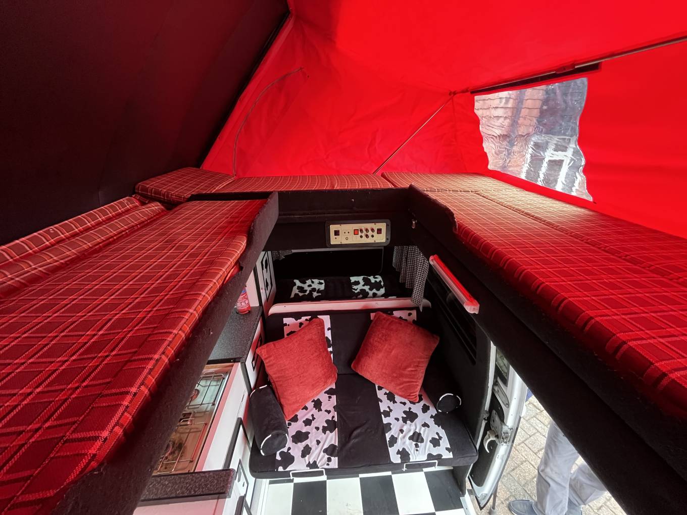 Inside, it’s a cozy mobile home with a fold-out bed, a compact kitchen including a gas hob and grill,, sink and storage cupboards The clever design emphasizes practicality in a small space, making it ideal for extended road trips or spontaneous weekend getaways.
