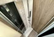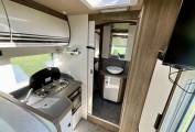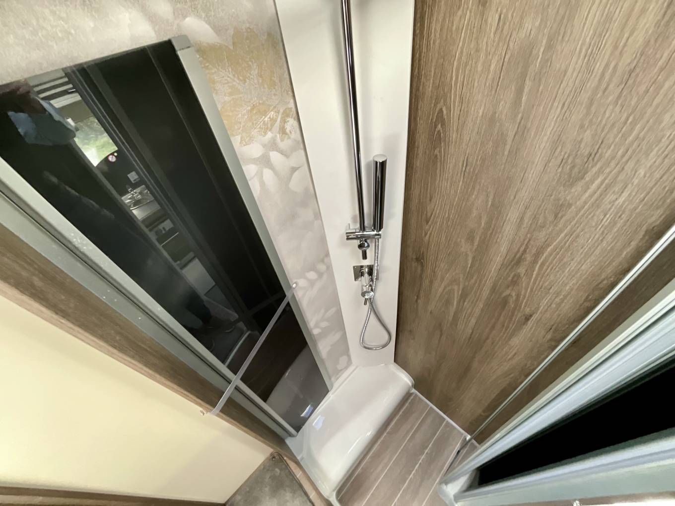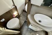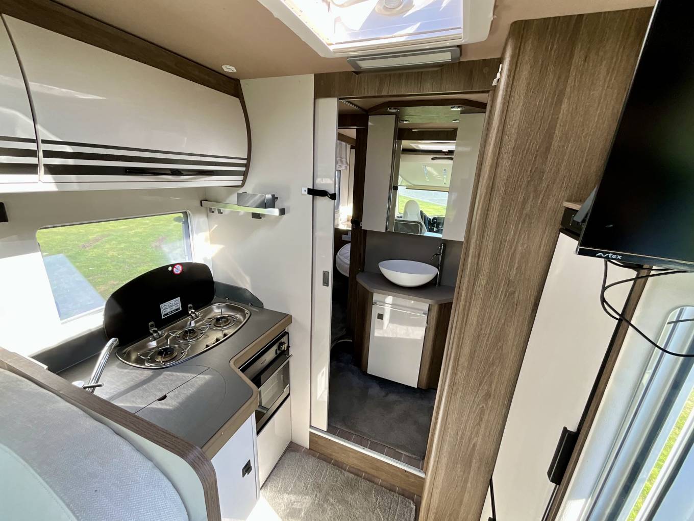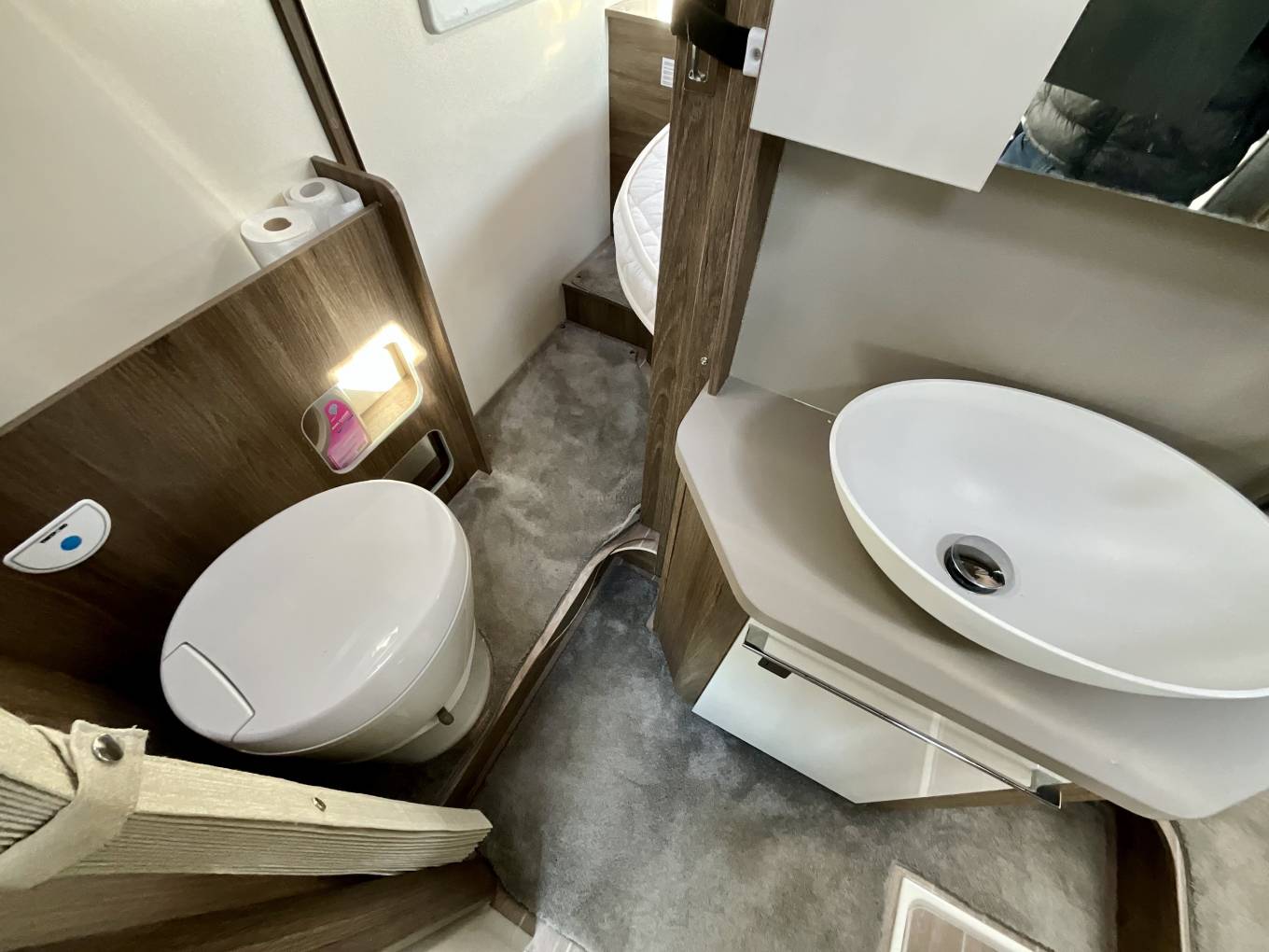Behind the kitchen, a mid washroom can be found with a sizeable shower, washbasin with LED lit vanity unit, Thetford toilet with cassette and 240 sockets for a hairdryer.
