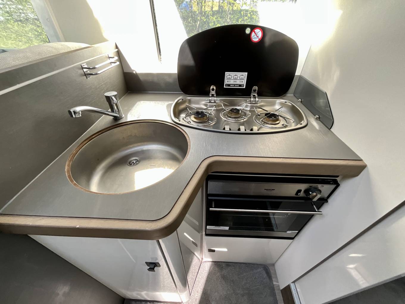 For cooking, the kitchen is fully equipped with three gas hobs, a Thetford oven and grill, Fridge with freezer, sink and plenty of storage throughout.