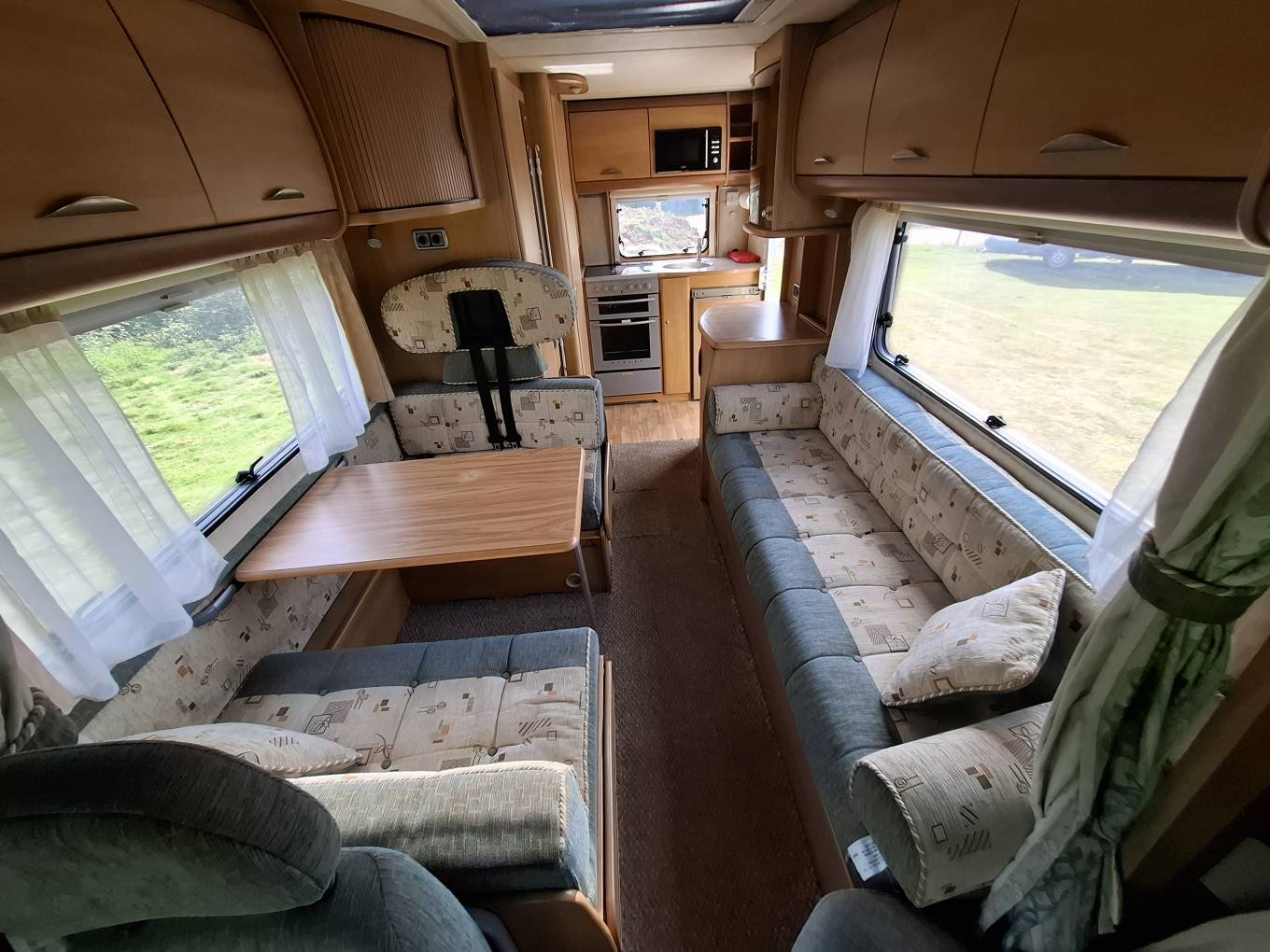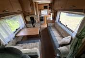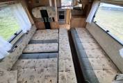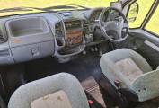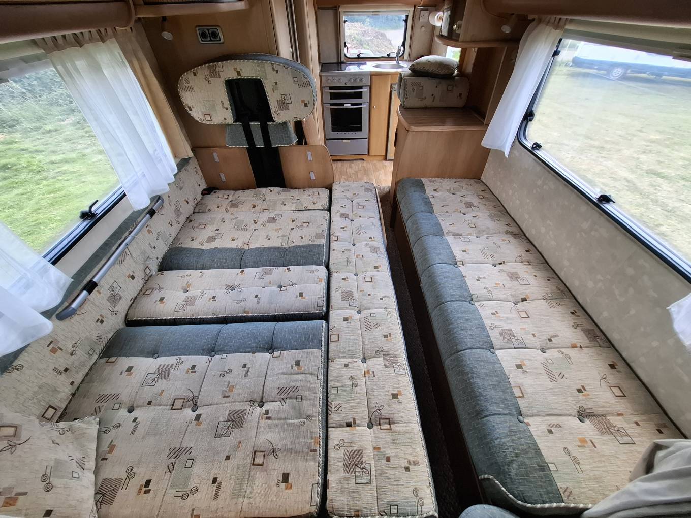 Behind the cab is a large leisure/dining area with an offside full dinette (complete with two additional forward facing seat belts), and a long nearside side sofa. The seating can be readily converted into either a large transverse double berth, or a smaller double berth and a single berth,