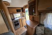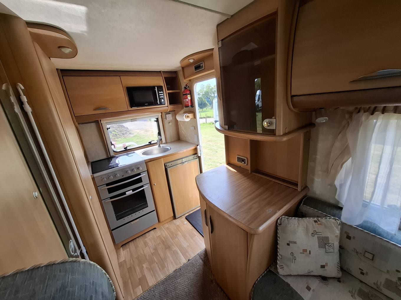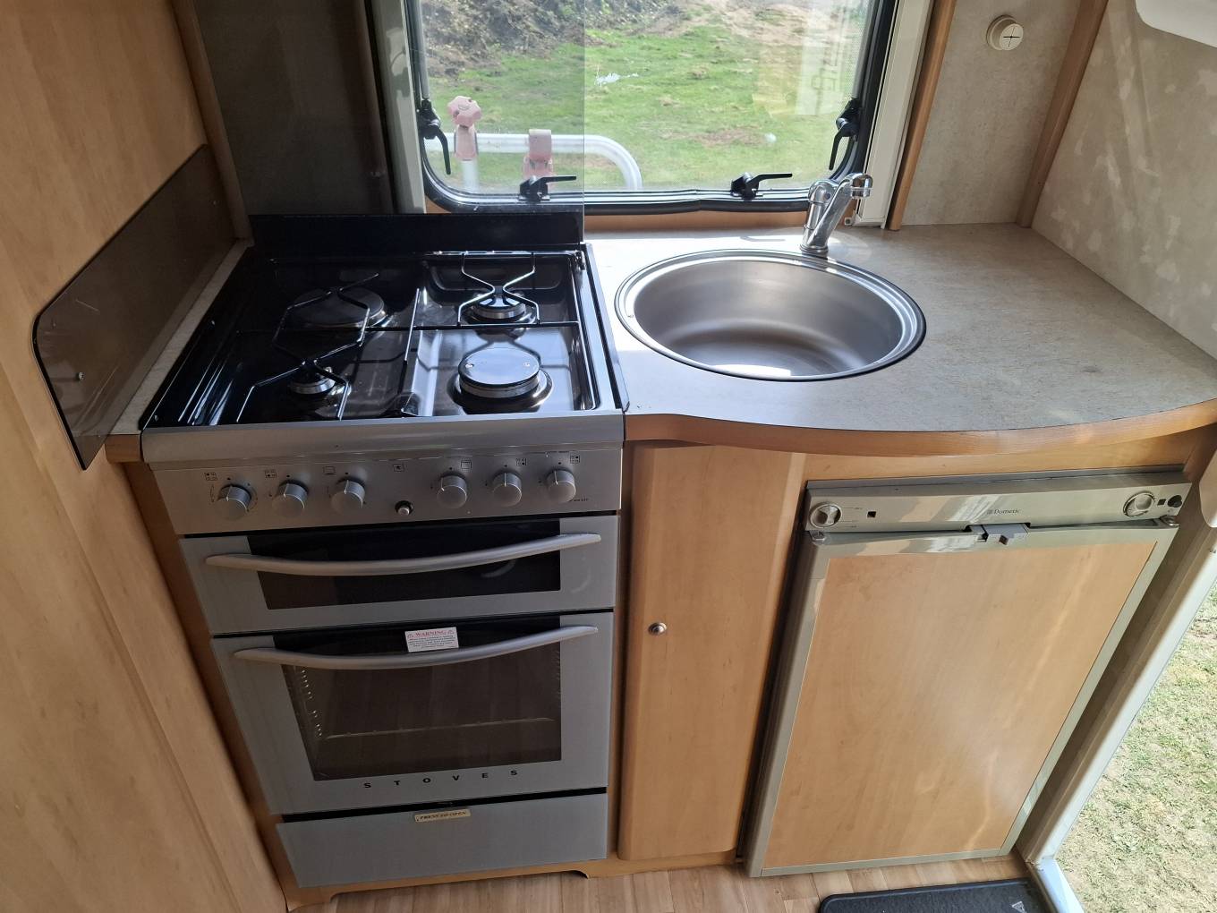 The kitchen is to the rear of the vehicle, with a hob with three gas burners and an electric plate, an oven, a grill, a microwave, a sink, and a fridge with a freezer box.