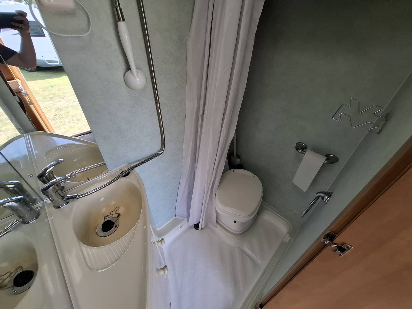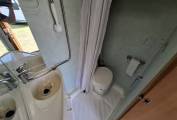Adjacent to the kitchen is the wetroom with a toilet, a hand basin, and a shower.
