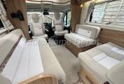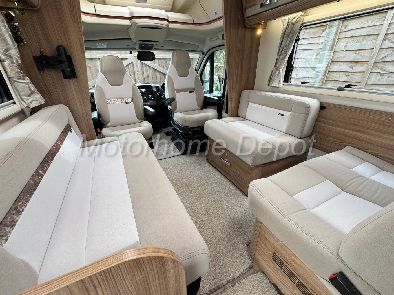 Enter via the electric step into a generous lounge area. To the left is a 3-seater side sofa, opposite a 2-seater forward-facing sofa with two 3-point seatbelts, plus an additional single side-facing seat. The cab seats swivel to create a large social space – comfortably seating 7–8 people.