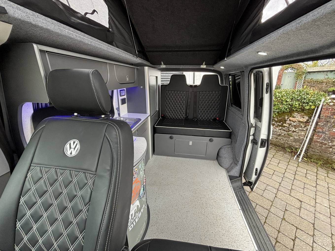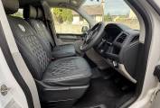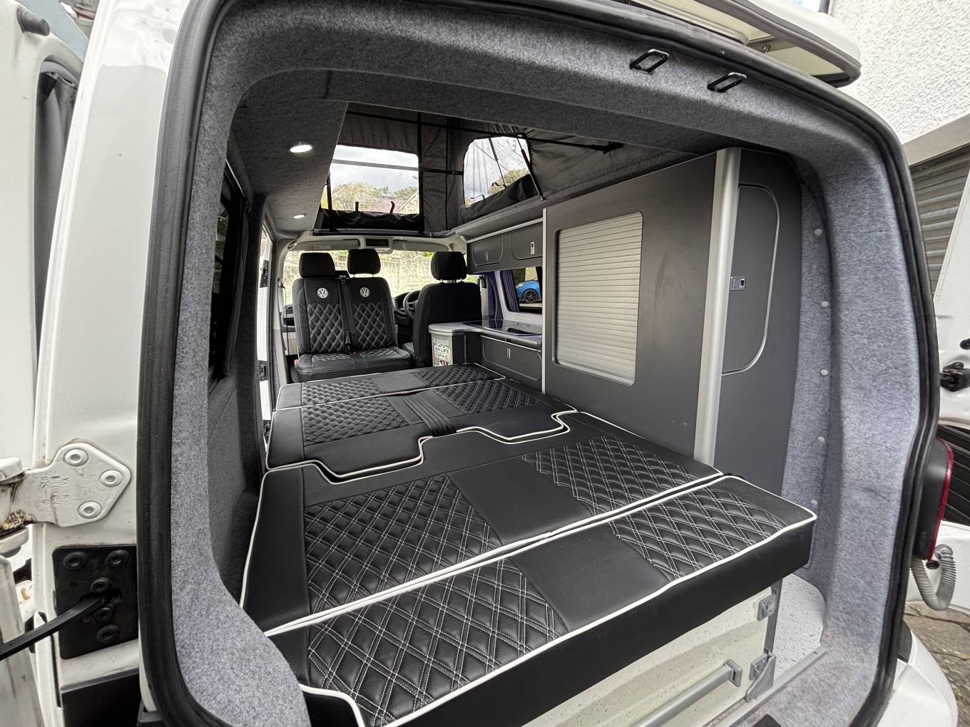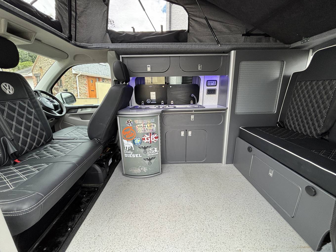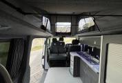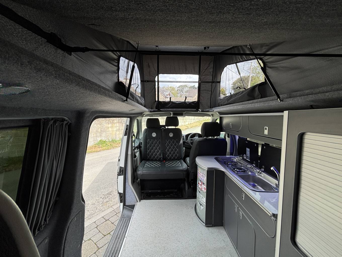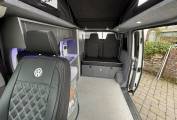To the rear, there is also the Rock n roll seat with 2 travelling belts and further storage below, which nicely converts to a double bed for sleeping. For further relaxation within the van the double front passenger seat is on a swivel base to give extra seating space within the van and has storage below. The pop top with zip down blinds gives extra headroom while moving about the van and is easily converted to an extra sleeping space for two.