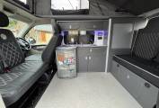 Inside the campervan along the far side, there is a built in unit with worktop, double gas hob, sink with tap, JustKampers 42L fridge with icebox, fresh water and grey waste water containers, various storage compartments, the Sargent 12 volt unit control and a multi position rail for the detachable stow away table for dining and relaxing.